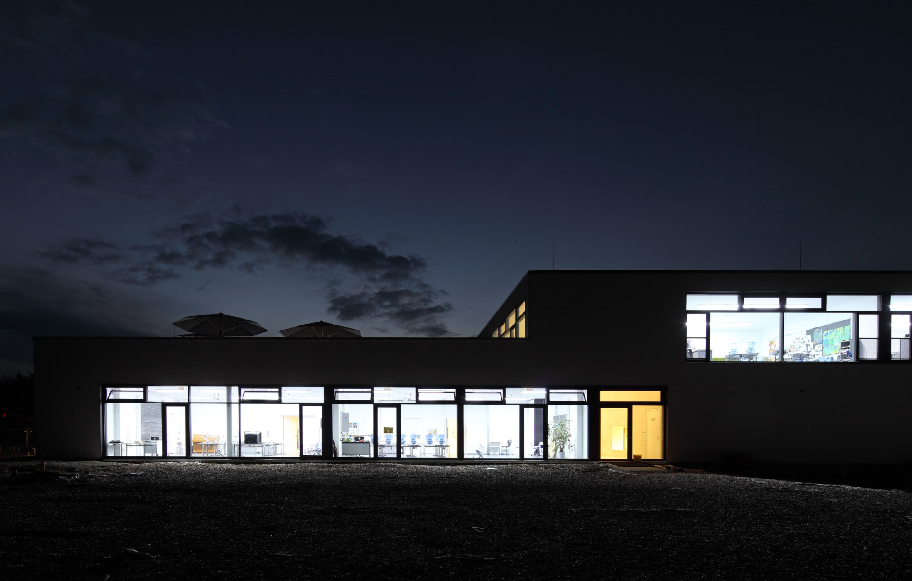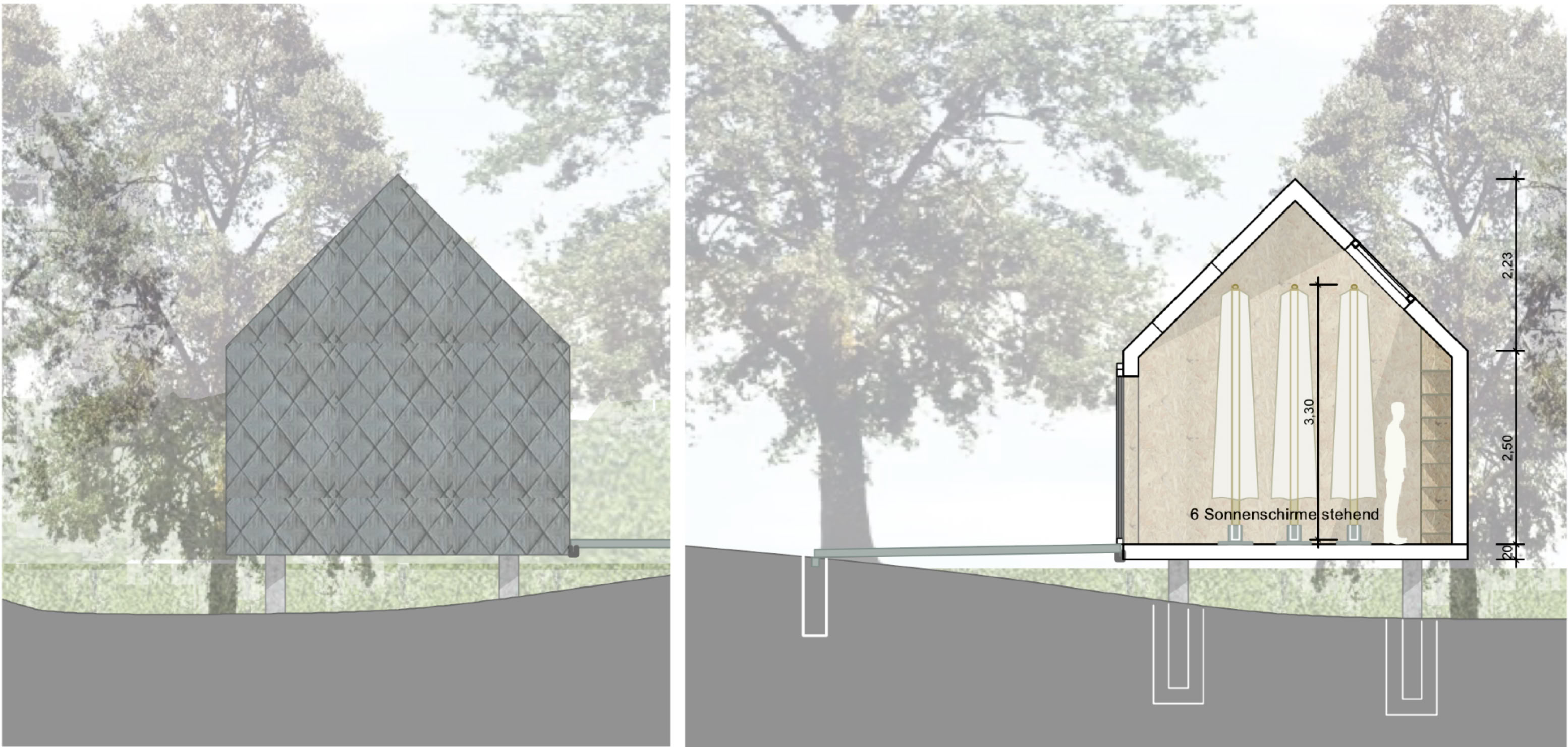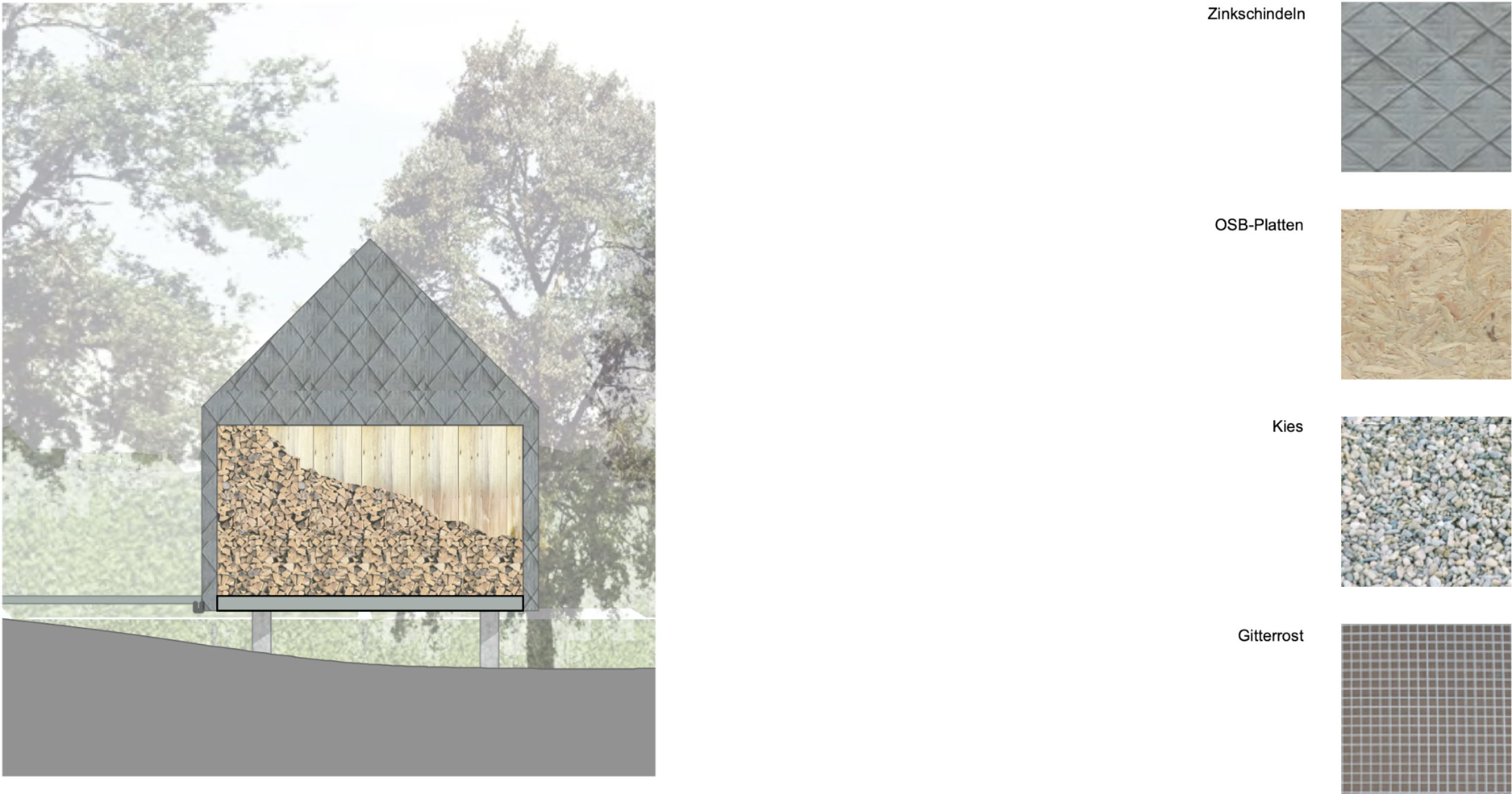Zwei verglaste Schiebetüren dienen als Zugang. An der Ostseite ist das Holzlager.