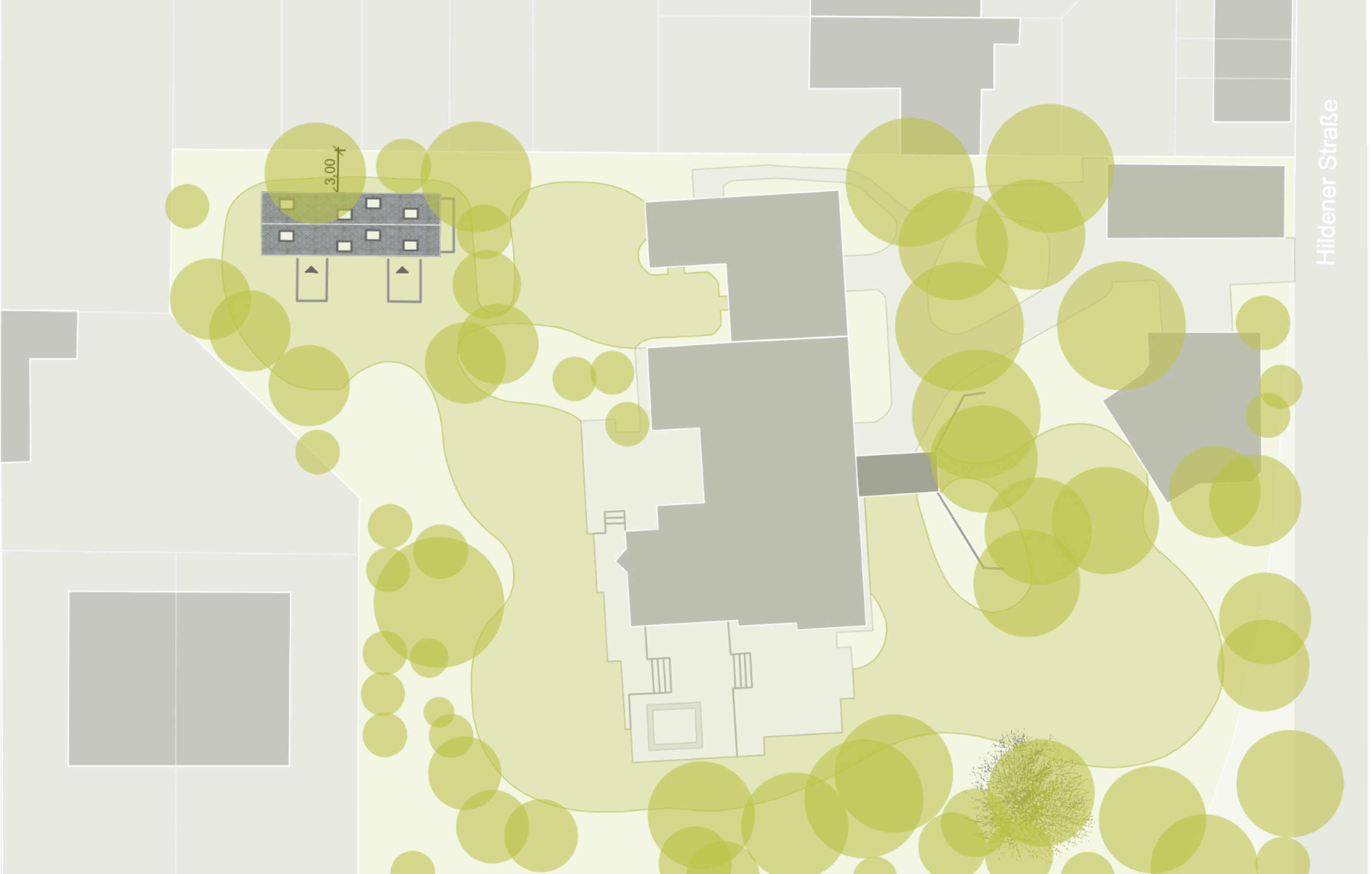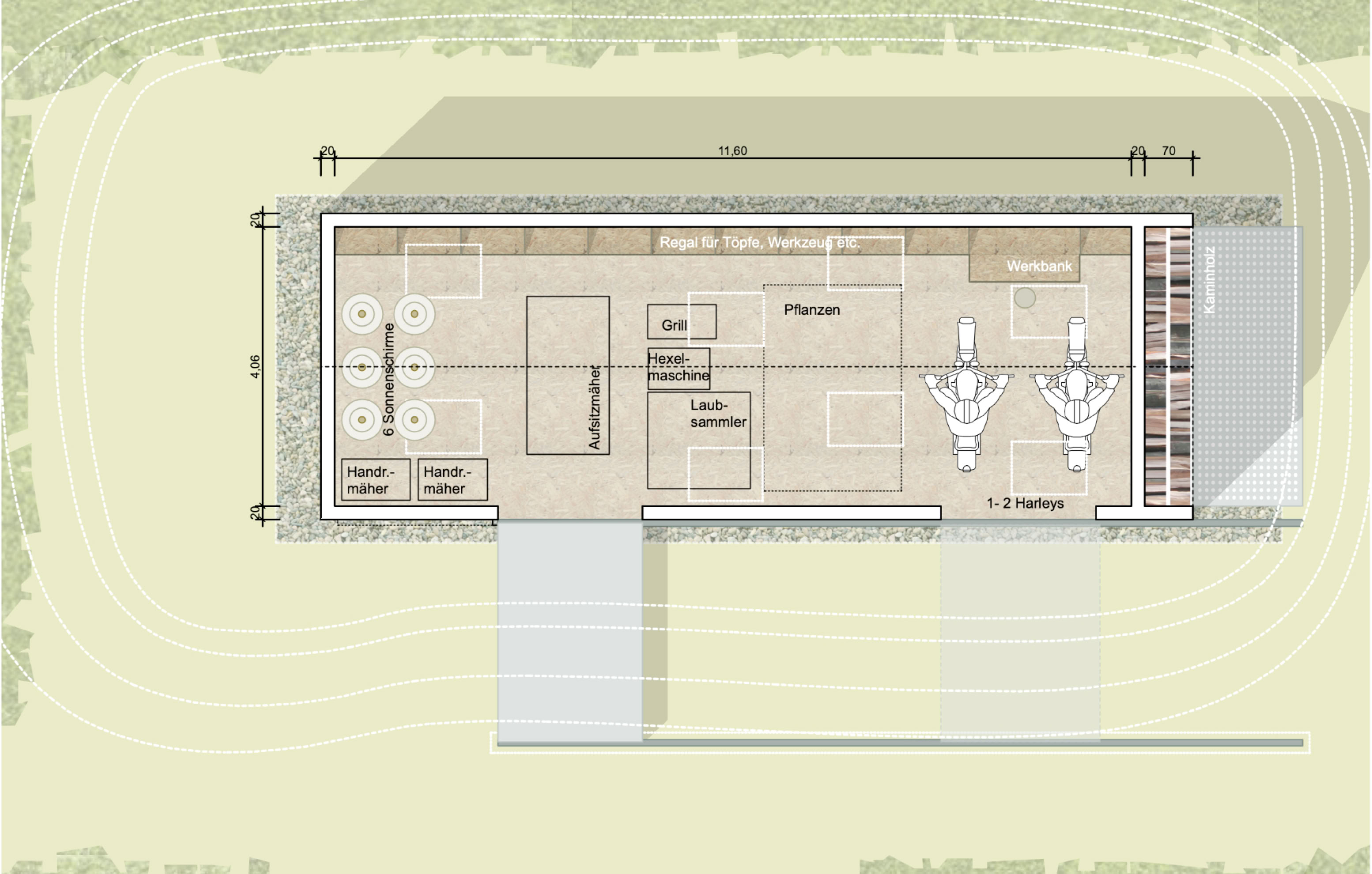 Möglichst sparsame Erdarbeiten, ein "schwebendes" Haus. Die Bodensenke bleibt, der Schuppen wird auf Pfähle gegründet.