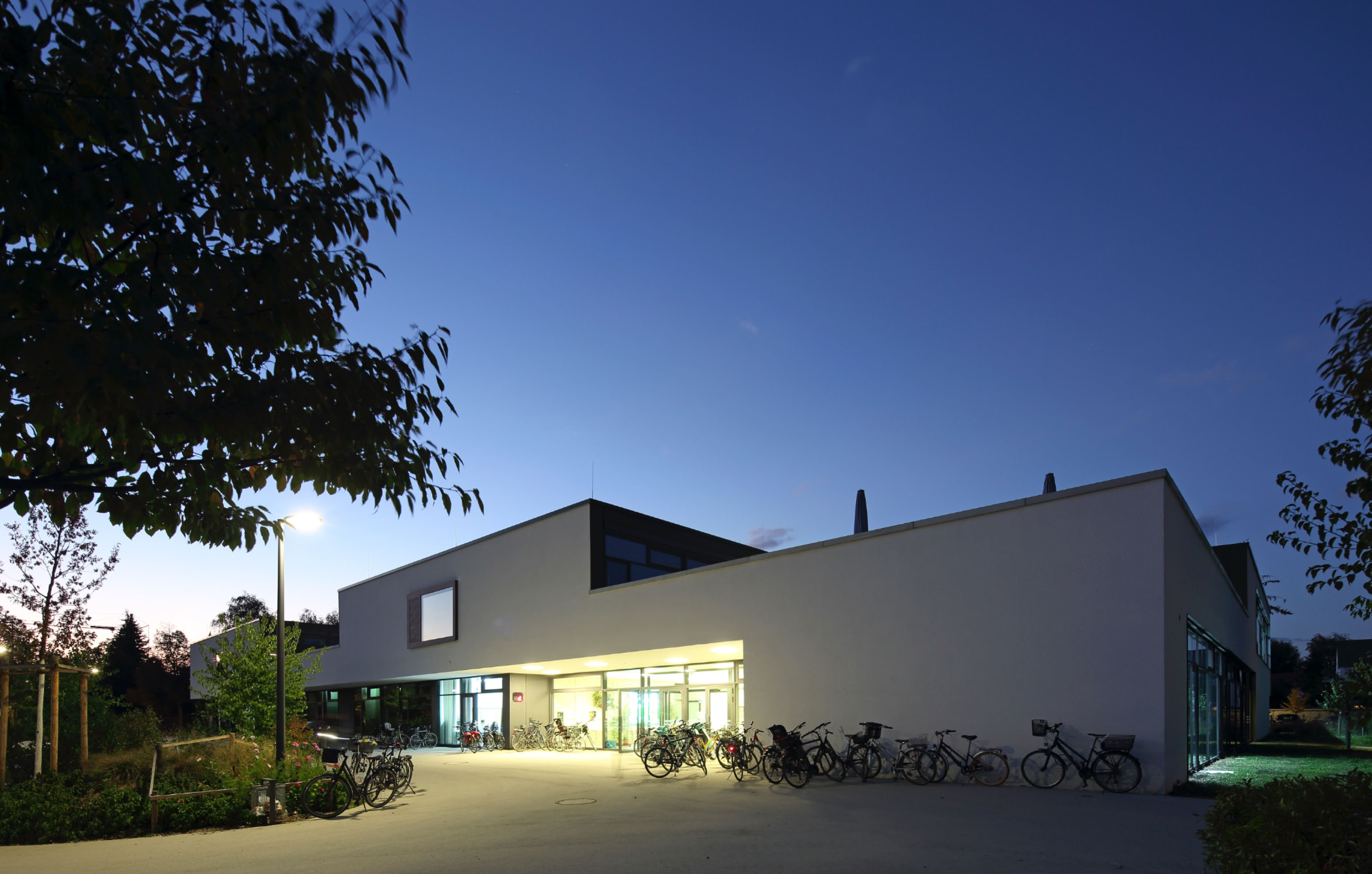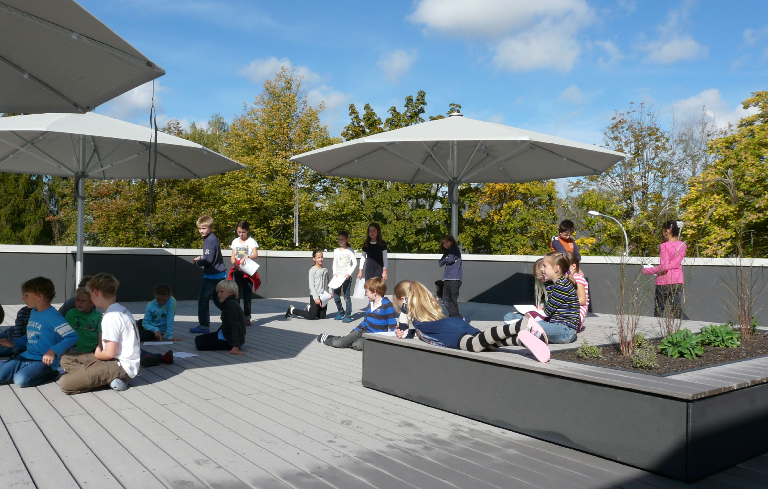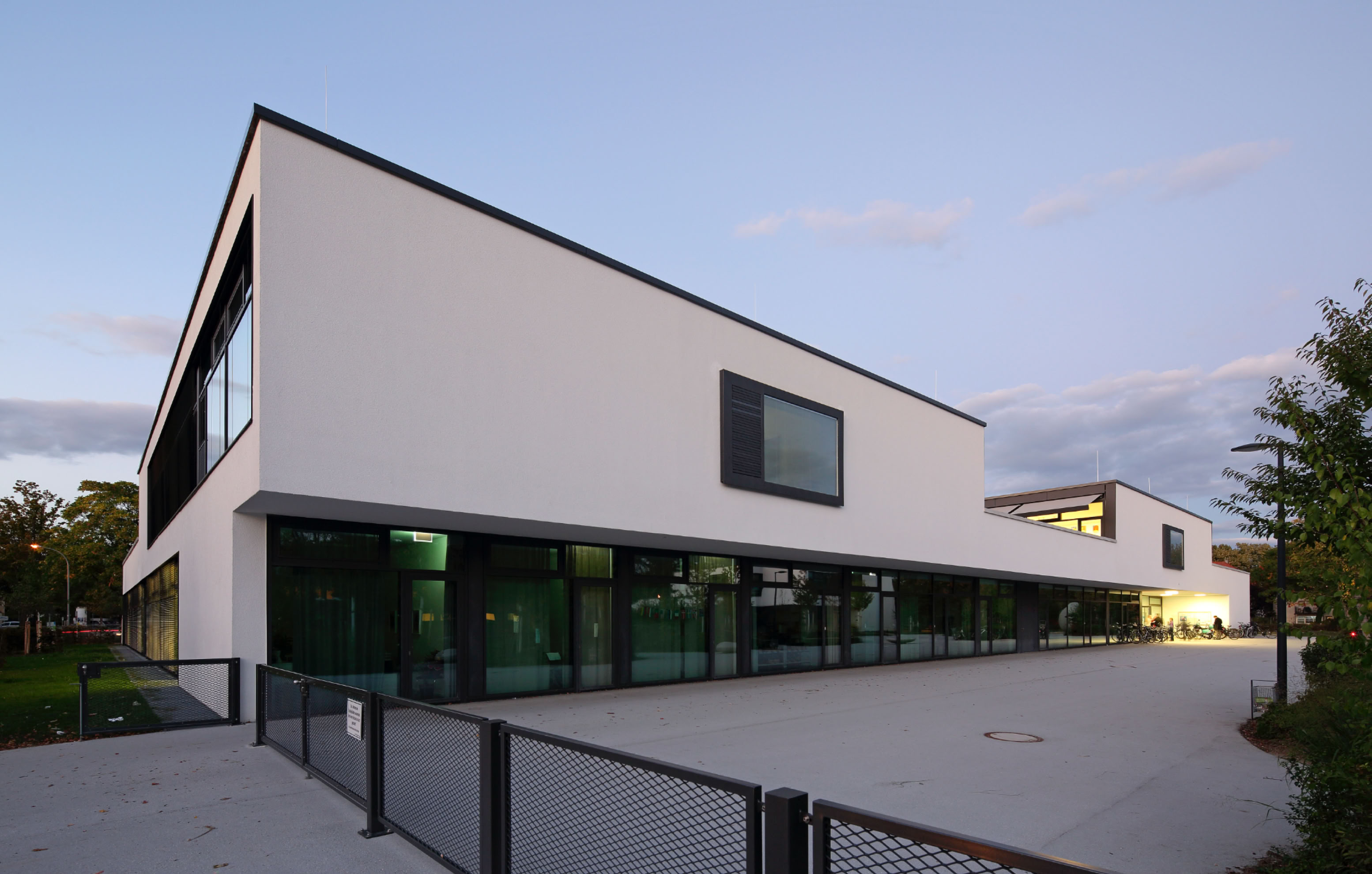 Das Schulhaus und die Mittagsversorgung bilden gemeinsam mit dem bestehenden Kinderhort ein campusartiges Ensemble, das den Pausenhof als zentrale Spielfläche arrondiert. Pausenhof, Schulgarten und die Sportanlagen sind als ineinander übergehende Aussenräume geplant und dennoch eigenständige Bereiche. Der Hauptzugang des Schulhauses und vis á vis der Eingang der Mittagsversorgung erfolgt über den Schulhof.