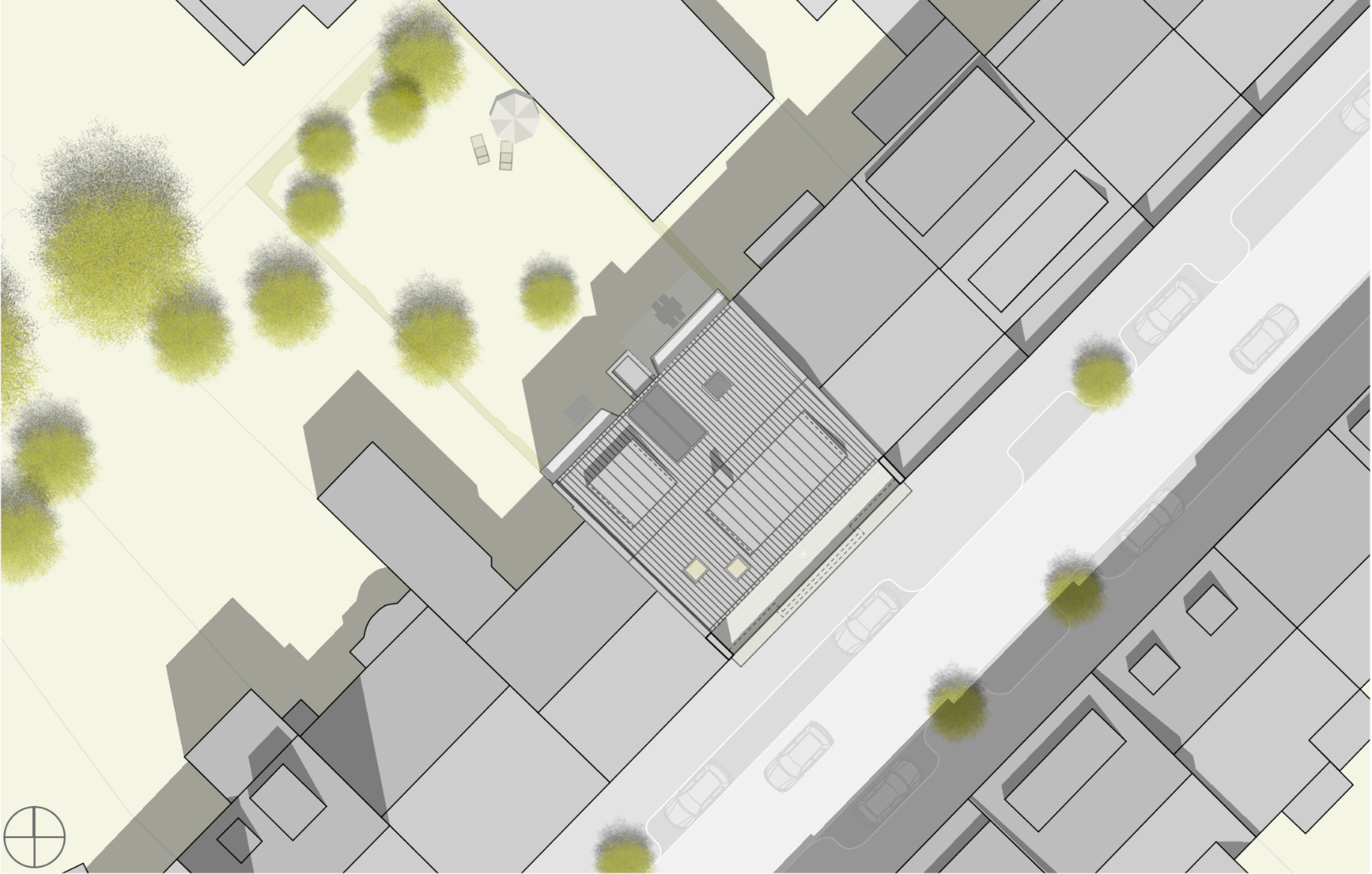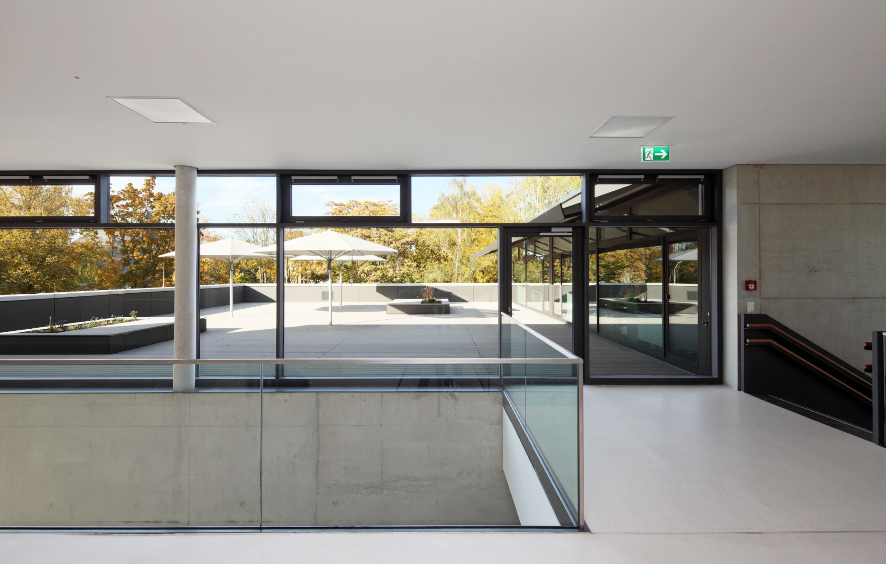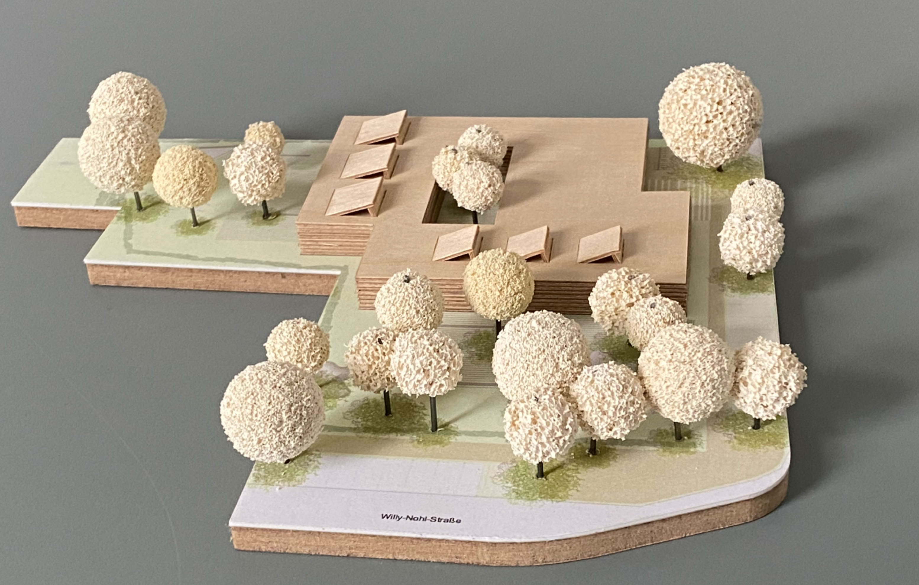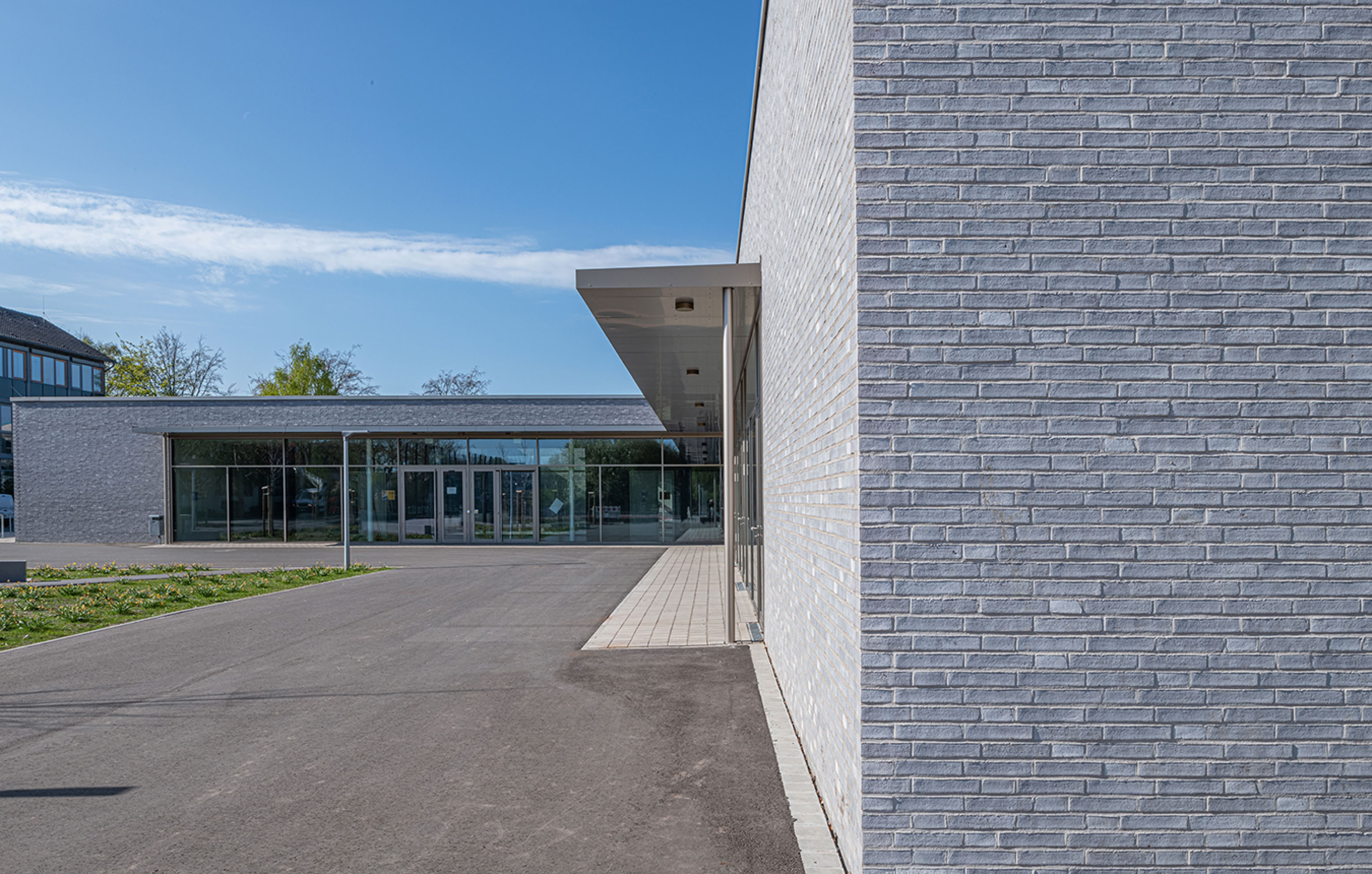 Das Schulhaus und die Mittagsversorgung bilden gemeinsam mit dem bestehenden Kinderhort ein campusartiges Ensemble, das den Pausenhof als zentrale Spielfläche arrondiert. Pausenhof, Schulgarten und die Sportanlagen sind als ineinander übergehende Aussenräume geplant und dennoch eigenständige Bereiche. Der Hauptzugang des Schulhauses und vis á vis der Eingang der Mittagsversorgung erfolgt über den Schulhof.