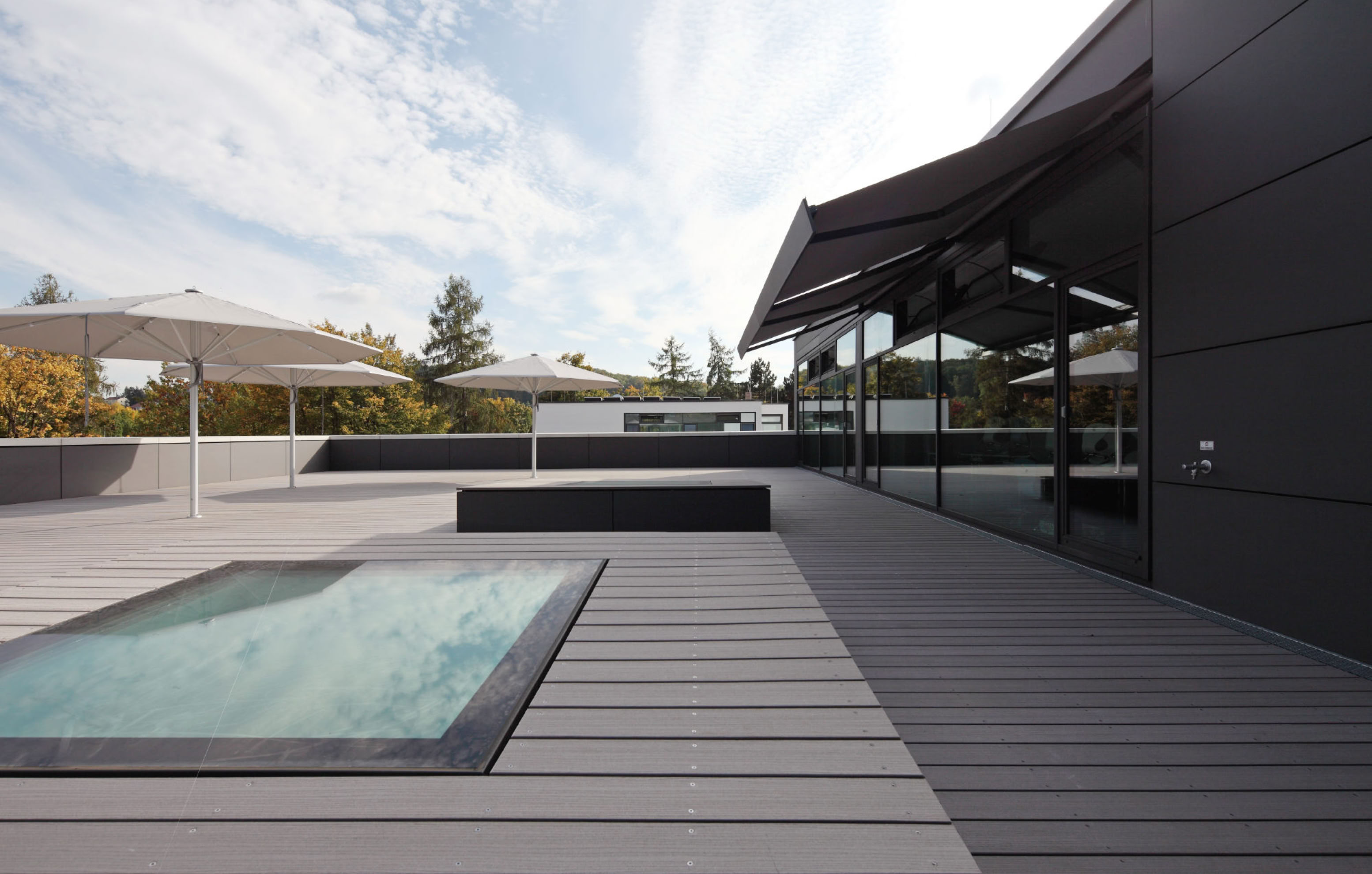 Eine auf Schienen gelagerte Gitterrostebene überbrückt das Gefälle und dient als minimierte Zugangsplattform, darunter bleibt es grün.