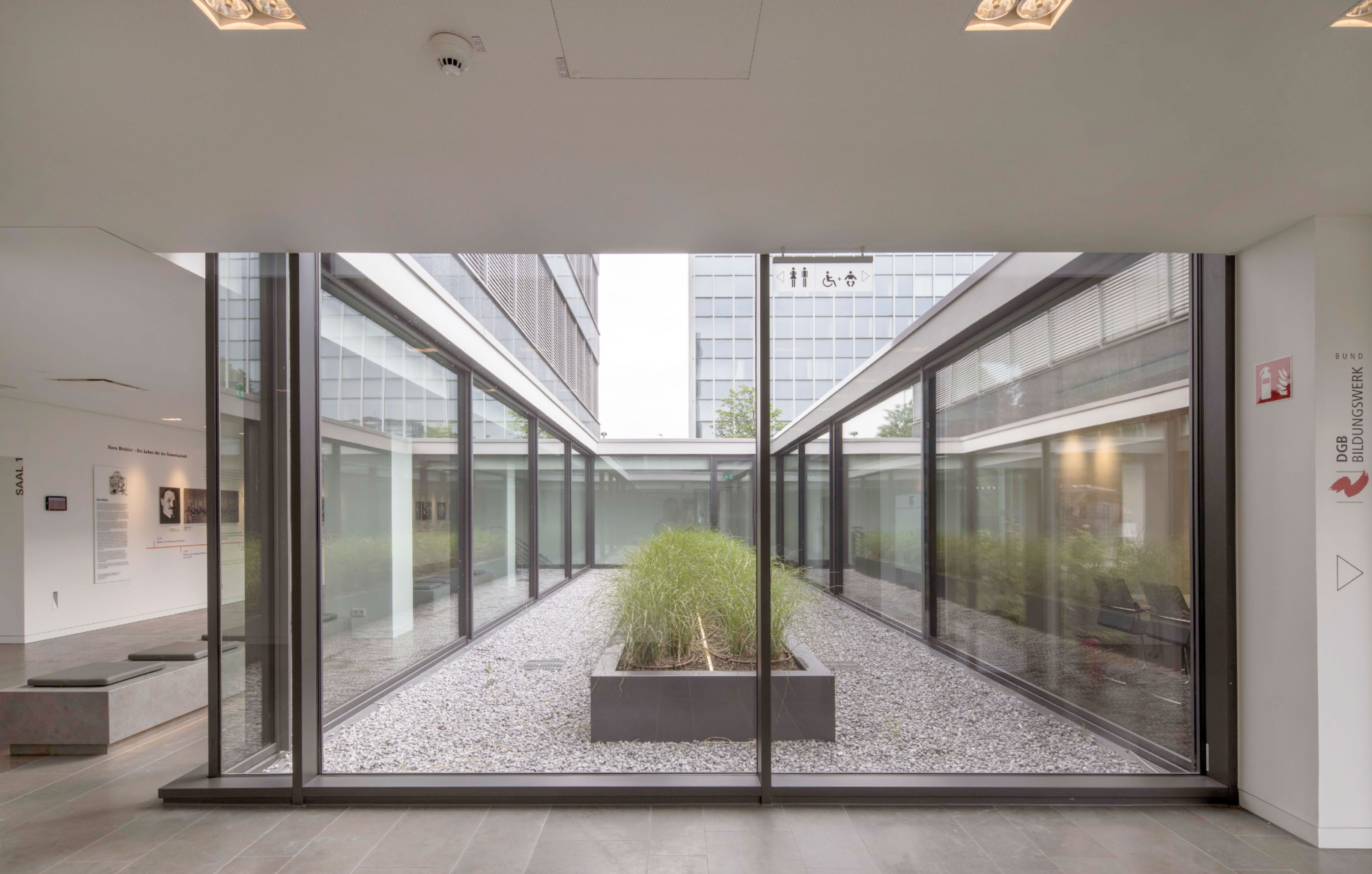 Das Gewerkschaftshaus des DGB Stuttgart ist in bester Innenstadtlage nahe dem Haus der Wirtschaft und der Börse situiert. Gemeinsam mit der Liegenschaft der VERDI Gewerkschaften bildet das Haus einen geschlossenen Baublock, der einen Innenhof arrondiert. Die bestehenden Bauten wurden in den 1930er und 1950er Jahren erstellt. In den vergangenen Jahren erfolgten immer wieder Umbauten und Teilsanierungen, die im Wesentlichen technisch bedingt waren und mithin weniger das gestalterische und funktionale Gesamte im Blick hatten. Das Haus wies eine große Gestalt- und Materialvielfalt auf. Im Rahmen einer Studie wurden Entwicklungsperspektiven für eine Revitalisierung und den Umbau des DGB-Hauses aufgezeigt. Zielsetzung war, eine übergeordnete Strategie für die Sanierung der Liegenschaft zu finden, ein funk-tionales, gestalterisches und technisches Konzept als Gerüst für weitere Maßnahmen zu entwickeln, sodaß weitere Teilsanierungen auch im Späteren (z.B. bei einem Mieterwechsel) ausführbar sind.