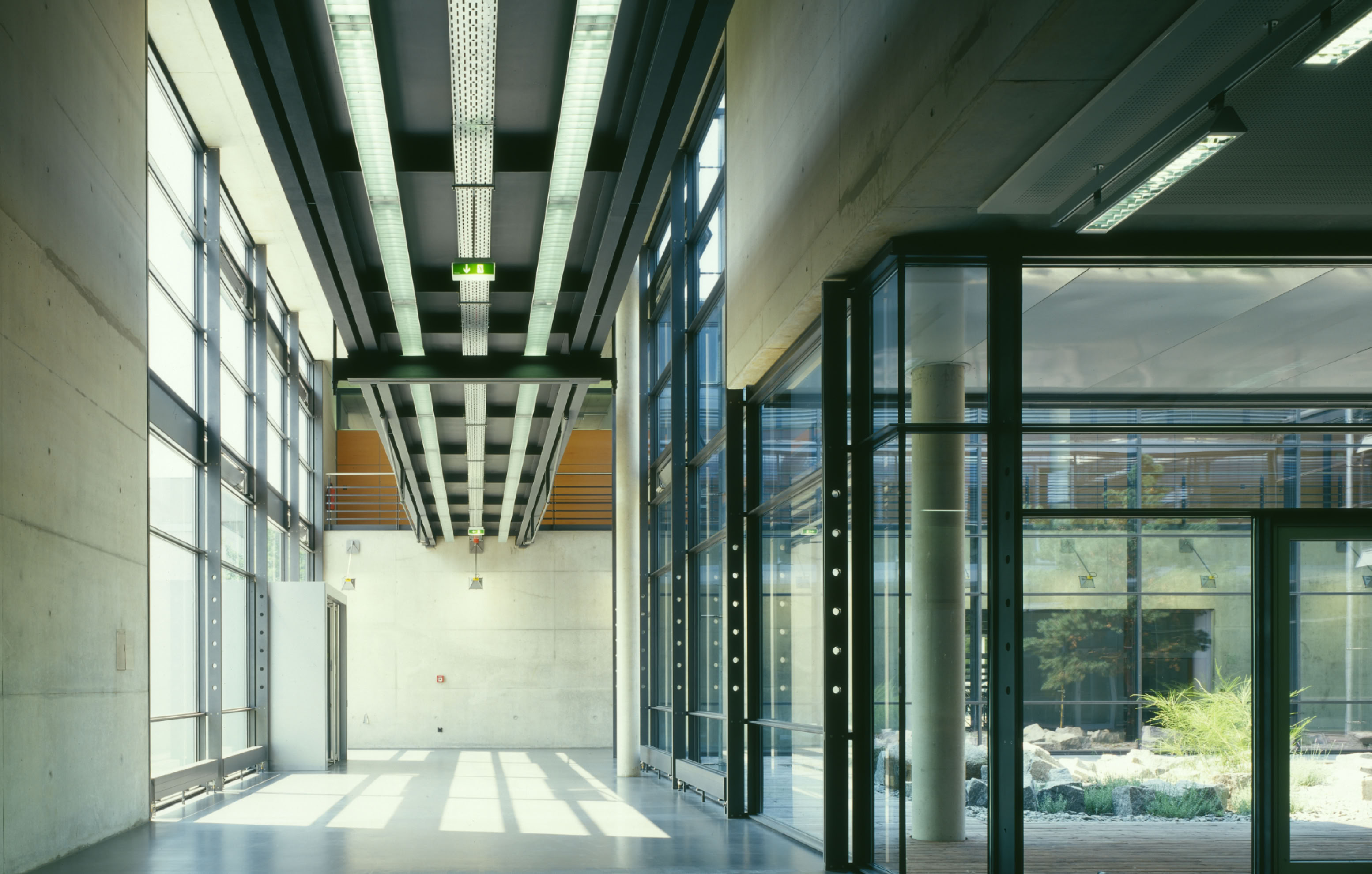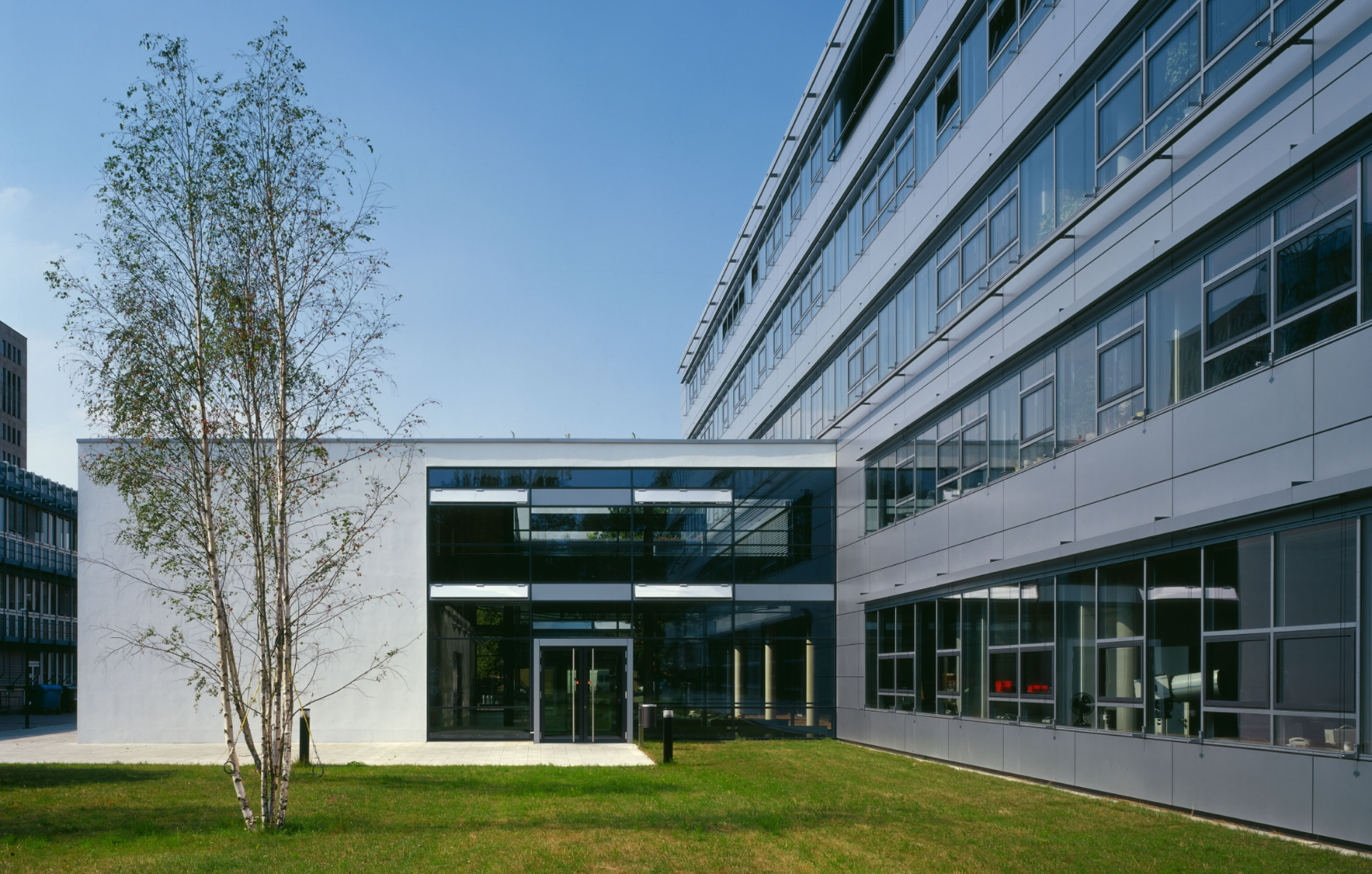 Alle Erschließungsflächen orientieren sich zur Straße, während die Arbeitsräume sich dem ruhigeren Innenbereich des Gebäudeensembles zu wenden. Der Eingangsbereich wurde um ein offenes, kommunikatives Atrium entwickelt. Die Flächen werden für Präsentationen der Fachbereiche genutzt. Die einfache Grundstruktur des Gebäudes gewährt eine leichte Orientierbarkeit. Die Labore, Seminar- und Büroräume werden von einer hellen, in weiten Bereichen raumhoch verglasten Flurzone erschlossen. Die äußere Gestalt interpretiert durch die Verwendung präziser Metallpaneelelemente und minimierte, bündig verarbeitete Stahl-Glasfassaden den technischen Habitus des Gebäudes.