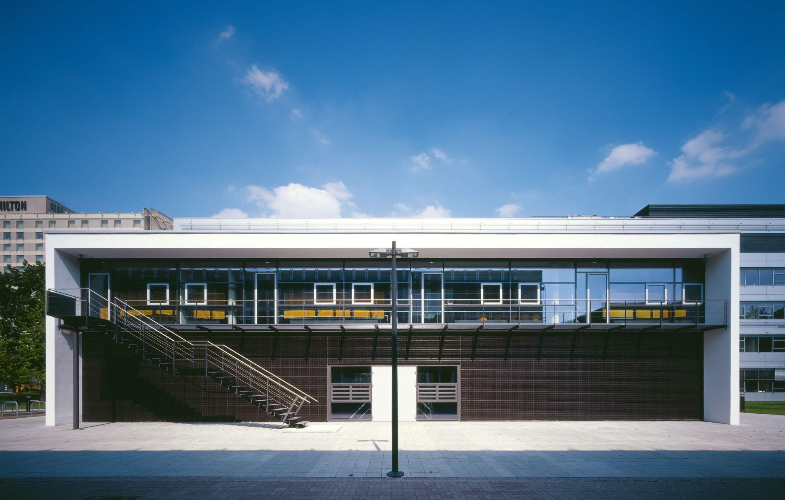Der fünfgeschossige Gebäuderiegel bildet einen markanten Abschluß der Fachhochschule zum stark befahrenen Flughafenzubringer "Kennedydamm".