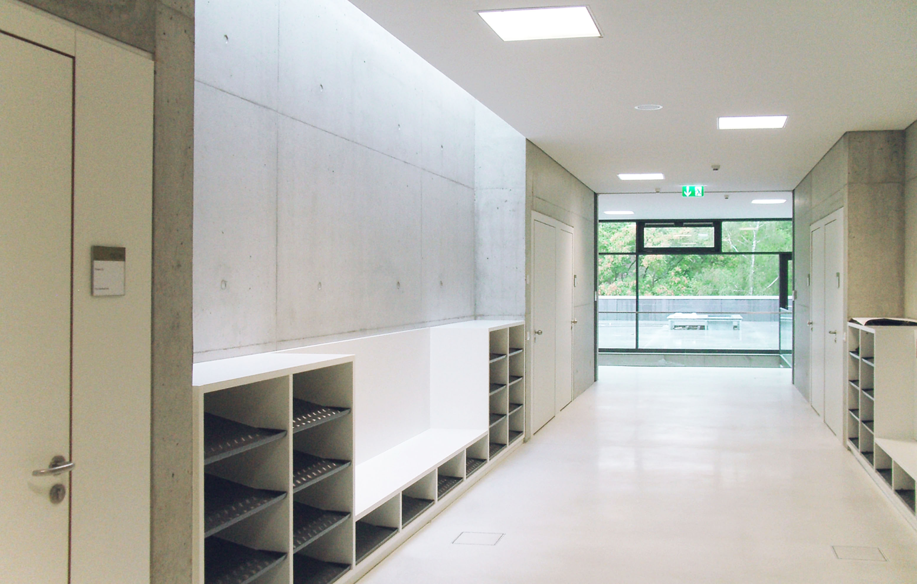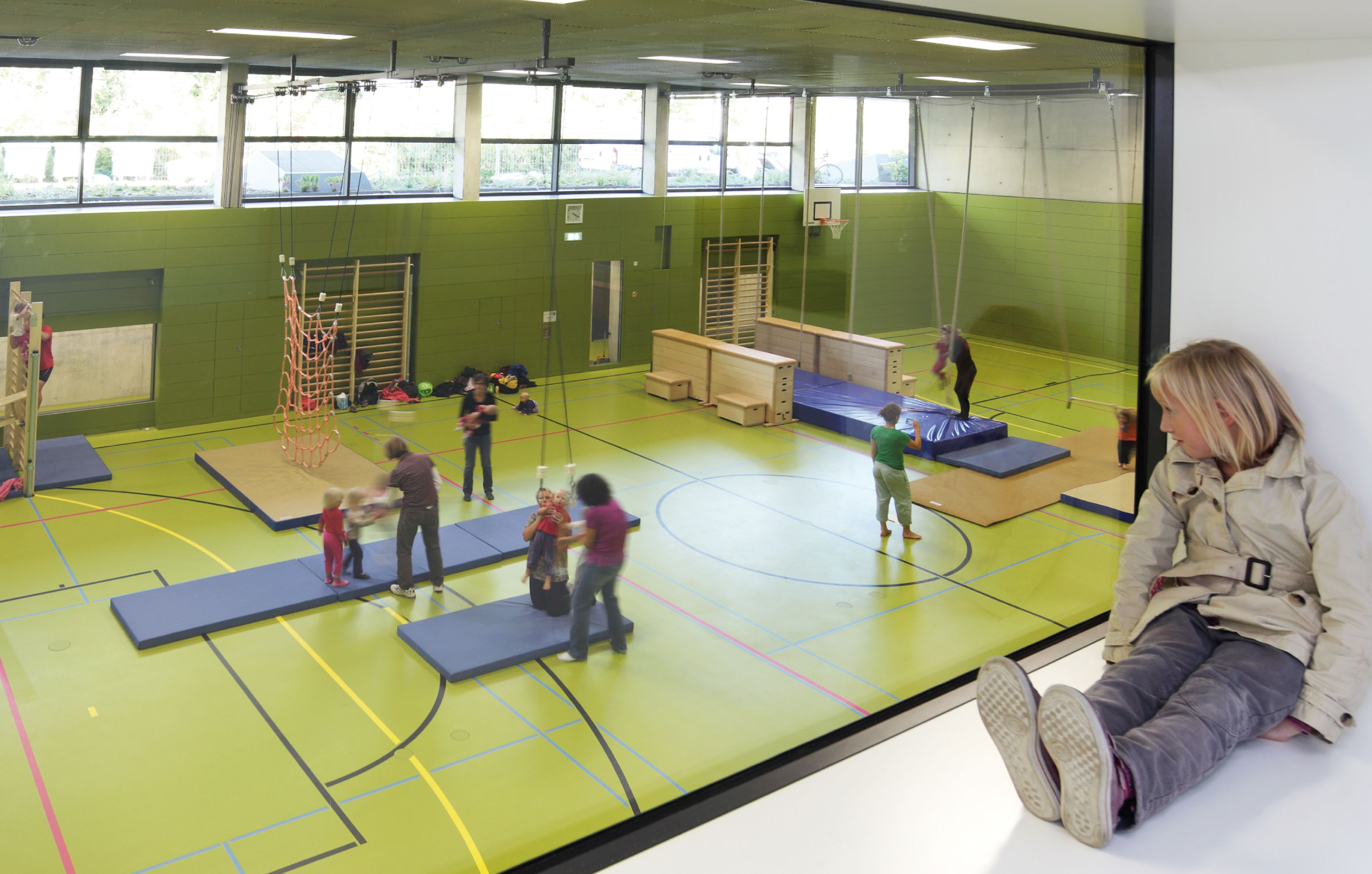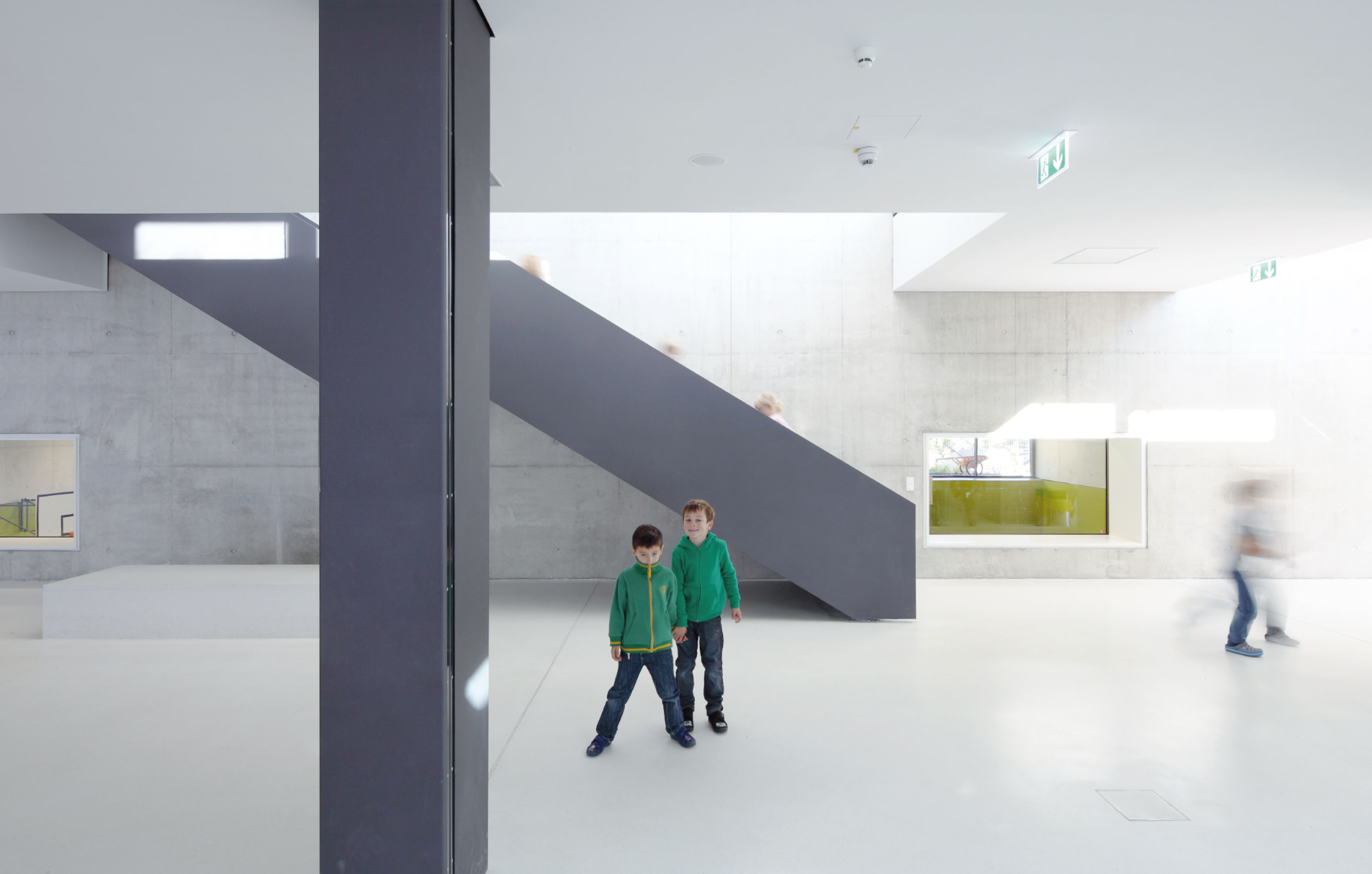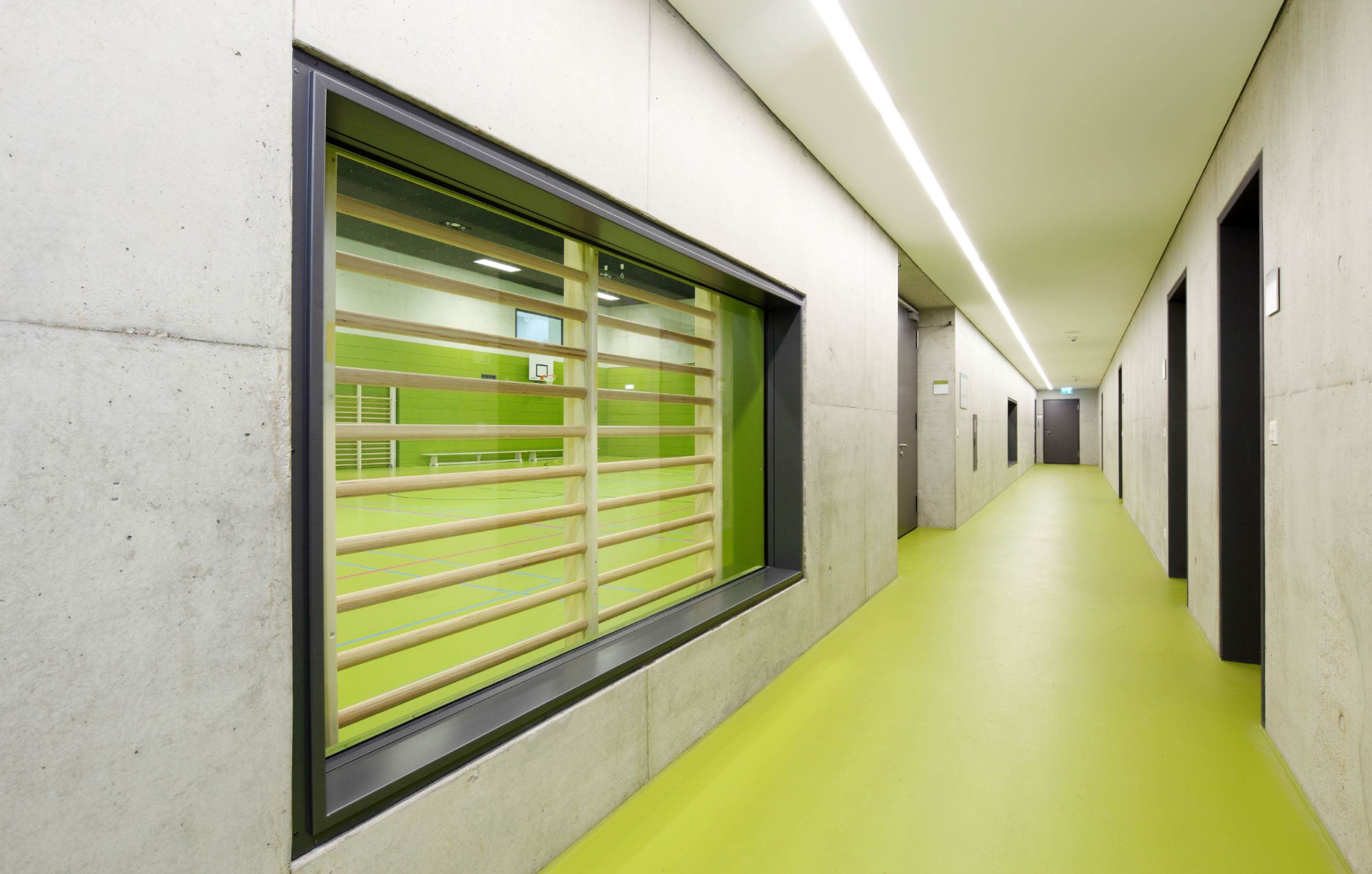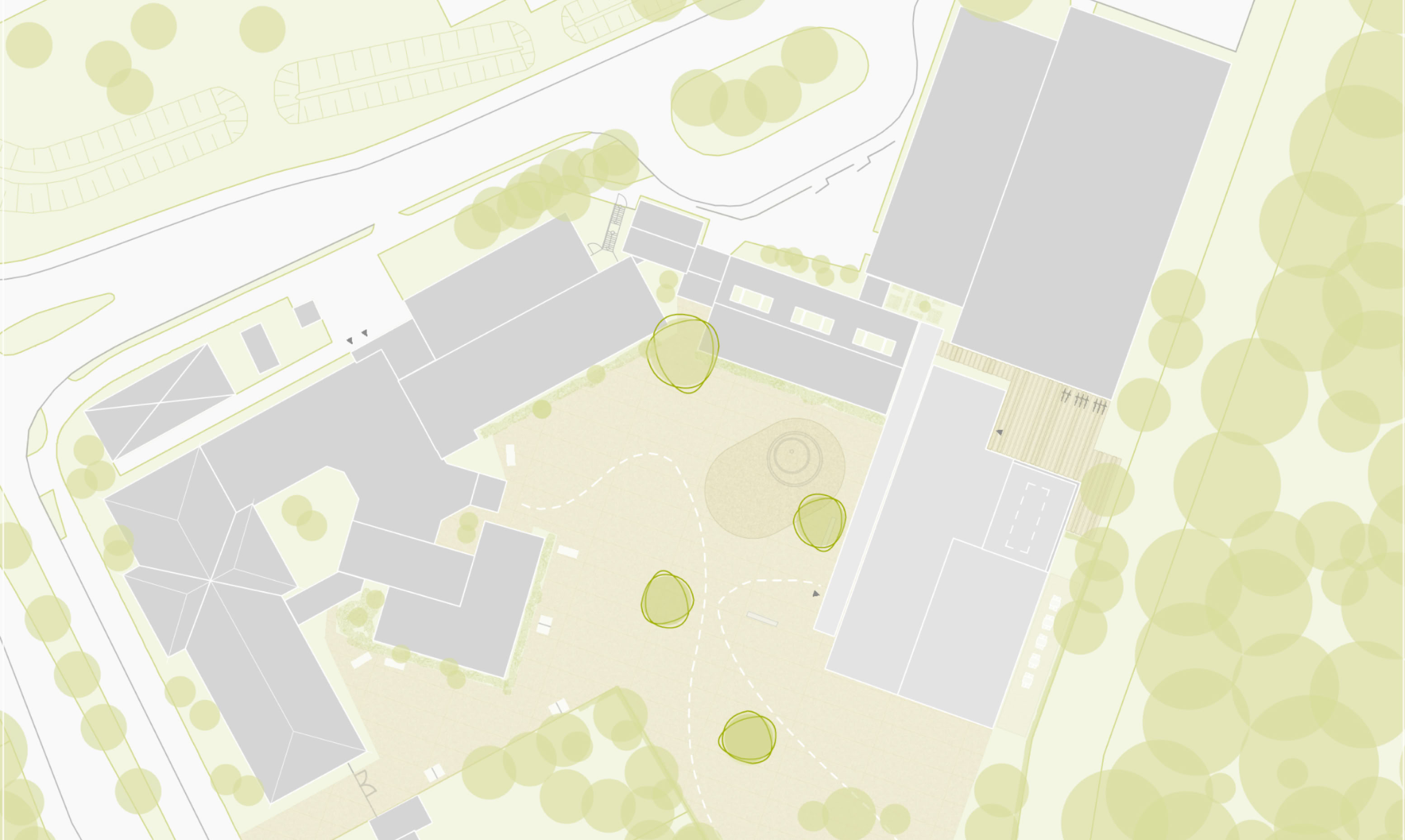 Das Schulhaus und die Mittagsversorgung bilden gemeinsam mit dem bestehenden Kinderhort ein campusartiges Ensemble, das den Pausenhof als zentrale Spielfläche arrondiert. Pausenhof, Schulgarten und die Sportanlagen sind als ineinander übergehende Aussenräume geplant und dennoch eigenständige Bereiche. Der Hauptzugang des Schulhauses und vis á vis der Eingang der Mittagsversorgung erfolgt über den Schulhof.