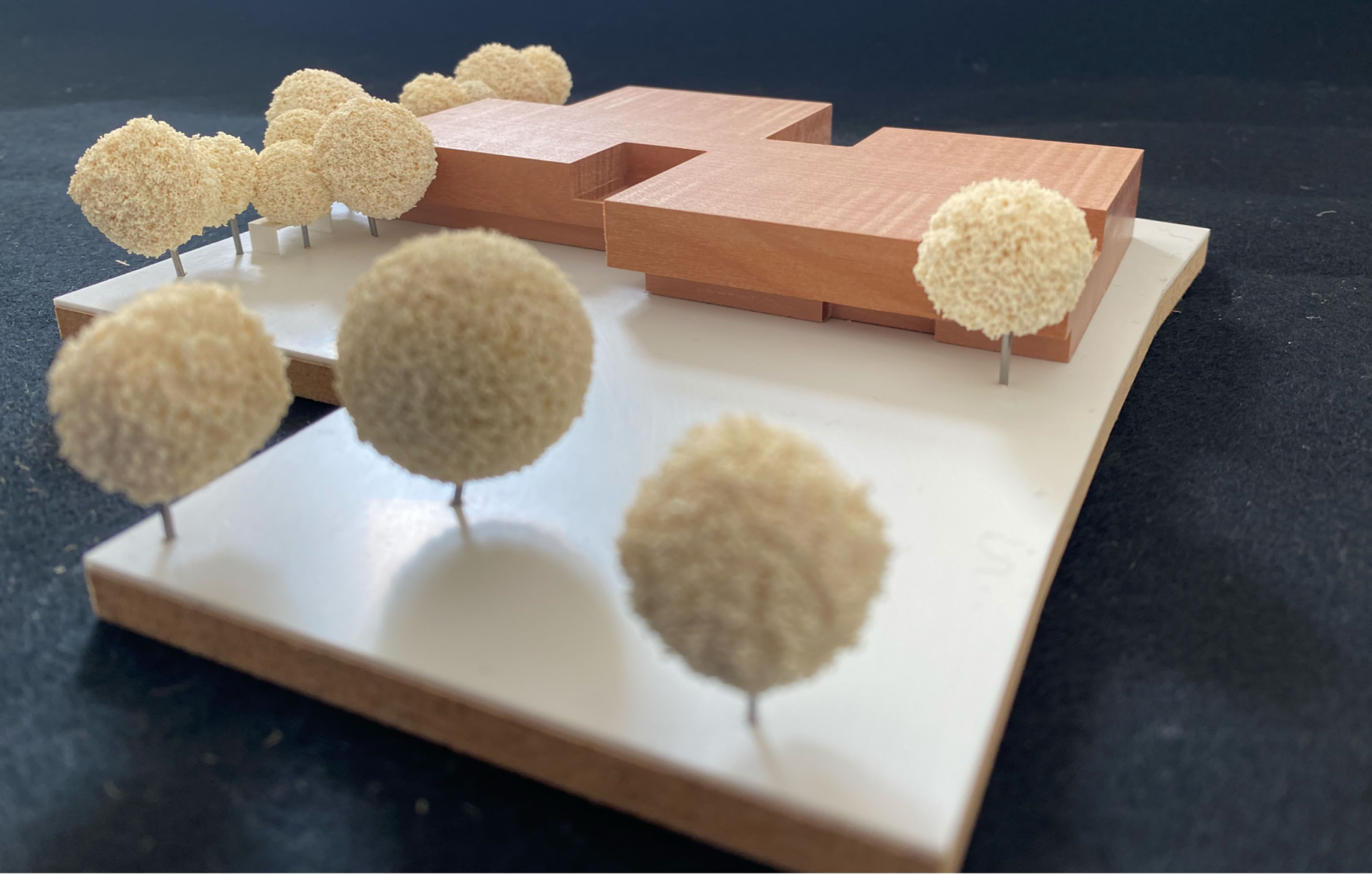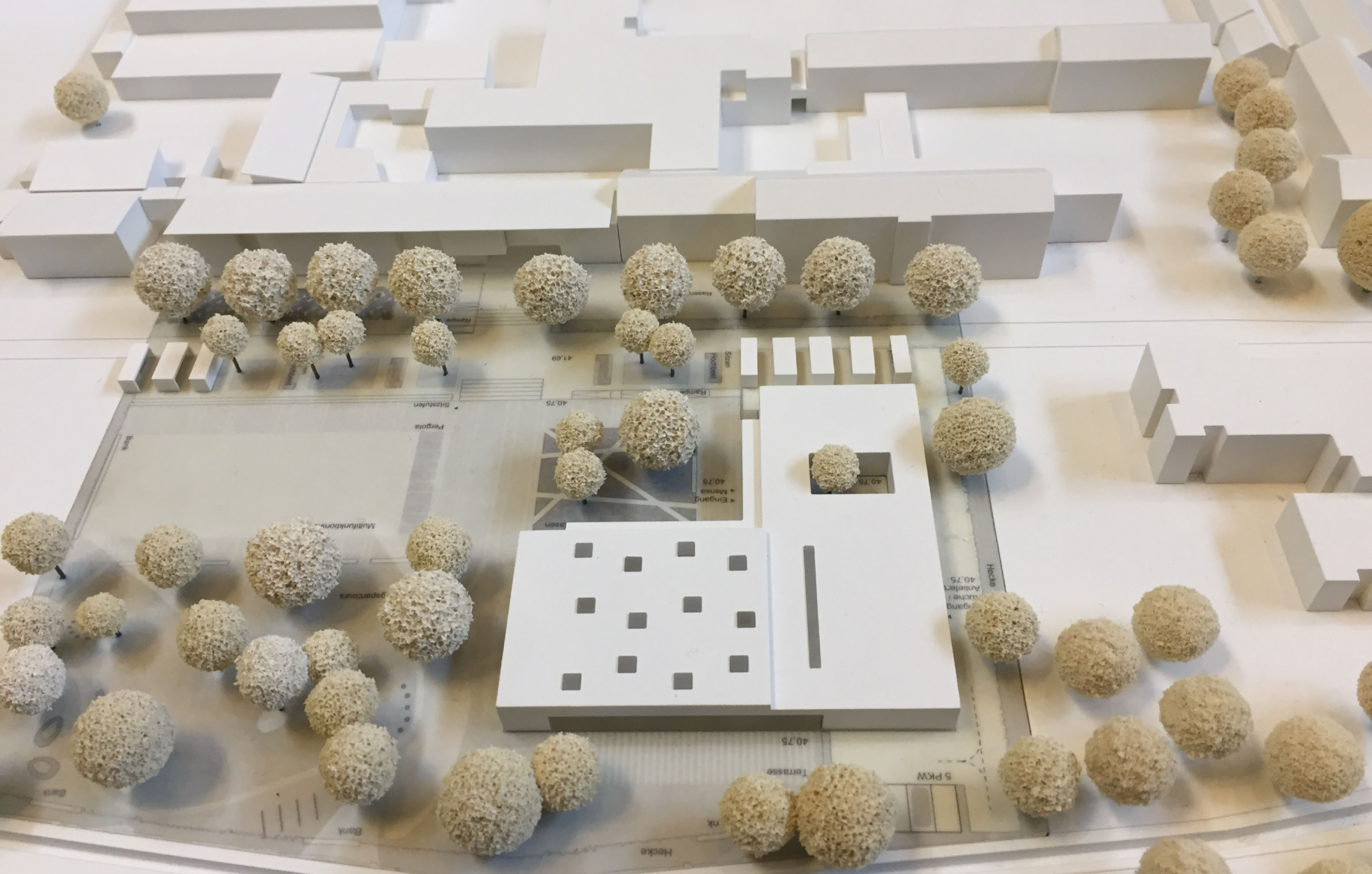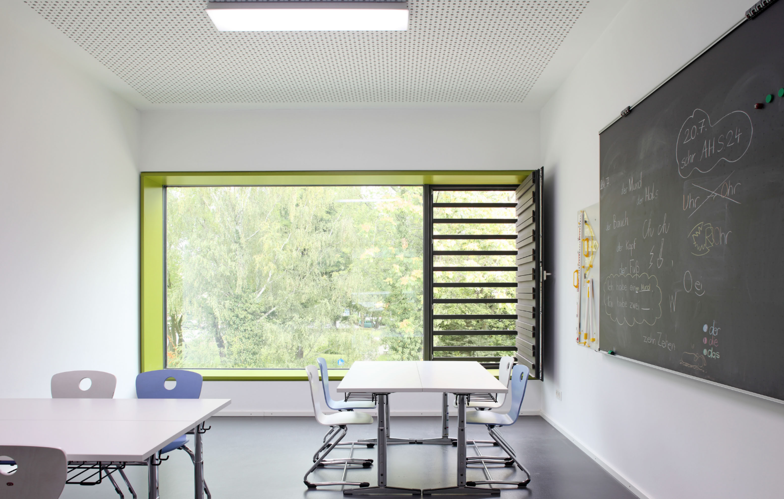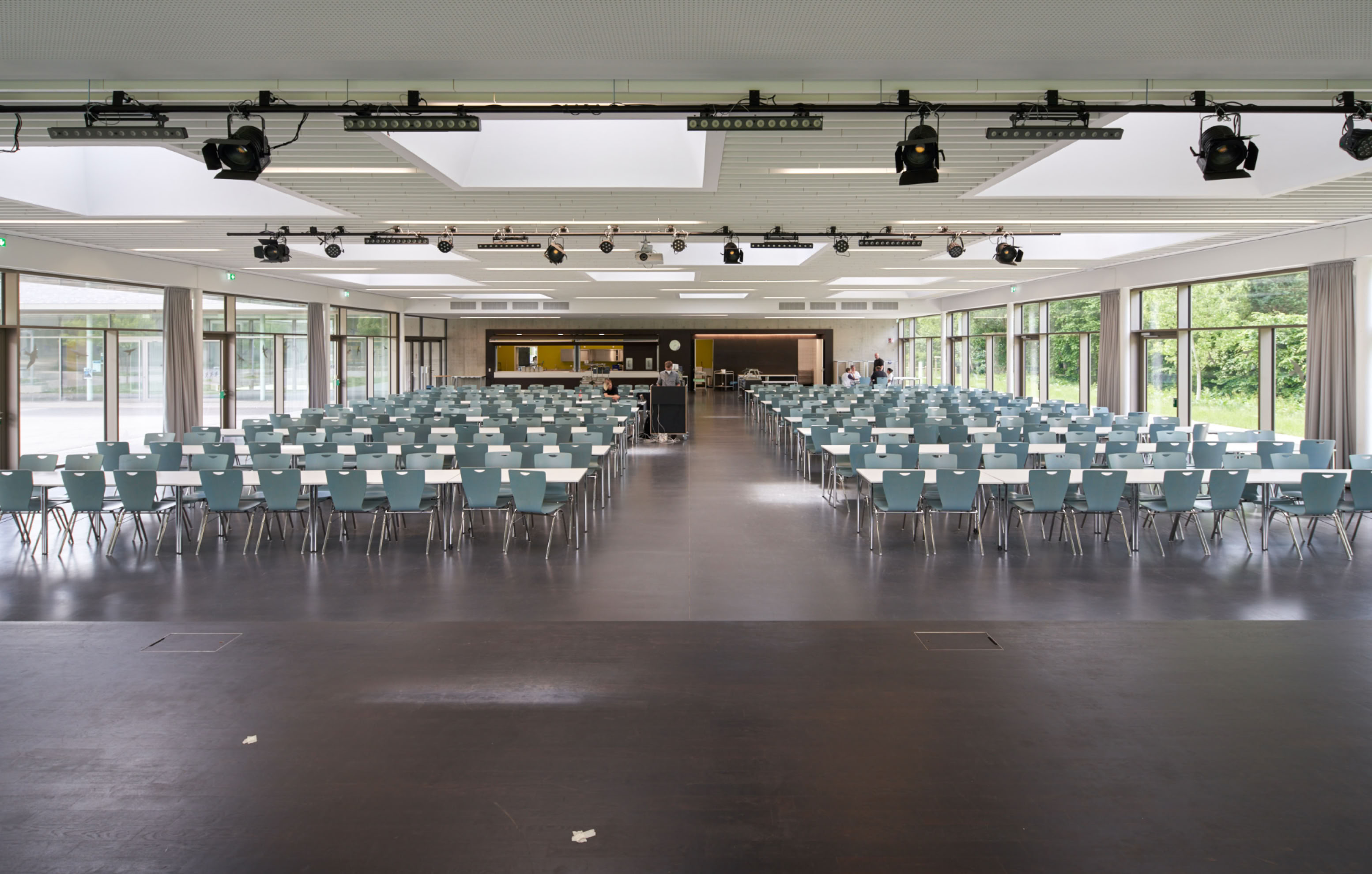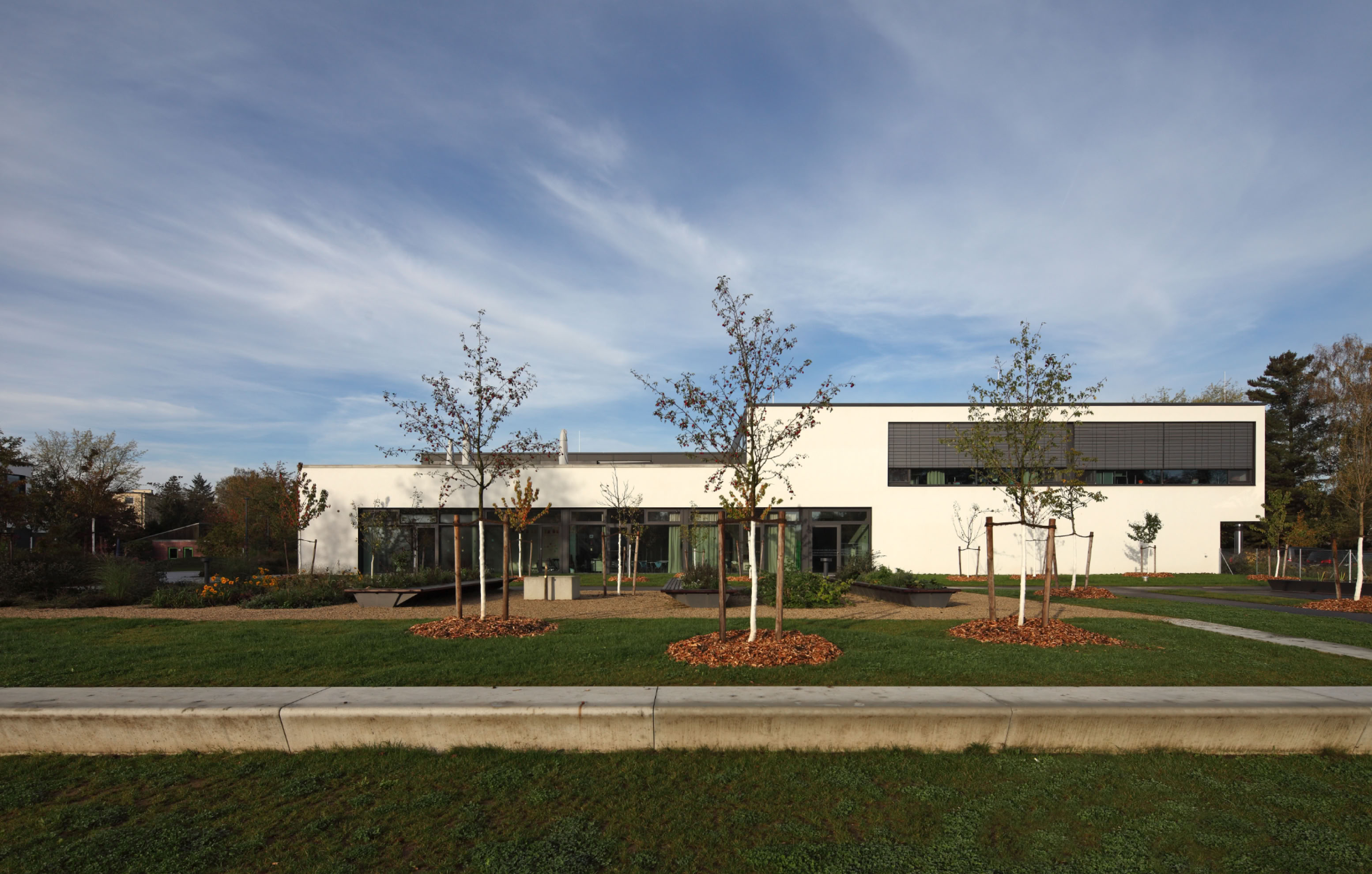 Das Schulhaus und die Mittagsversorgung bilden gemeinsam mit dem bestehenden Kinderhort ein campusartiges Ensemble, das den Pausenhof als zentrale Spielfläche arrondiert. Pausenhof, Schulgarten und die Sportanlagen sind als ineinander übergehende Aussenräume geplant und dennoch eigenständige Bereiche. Der Hauptzugang des Schulhauses und vis á vis der Eingang der Mittagsversorgung erfolgt über den Schulhof.