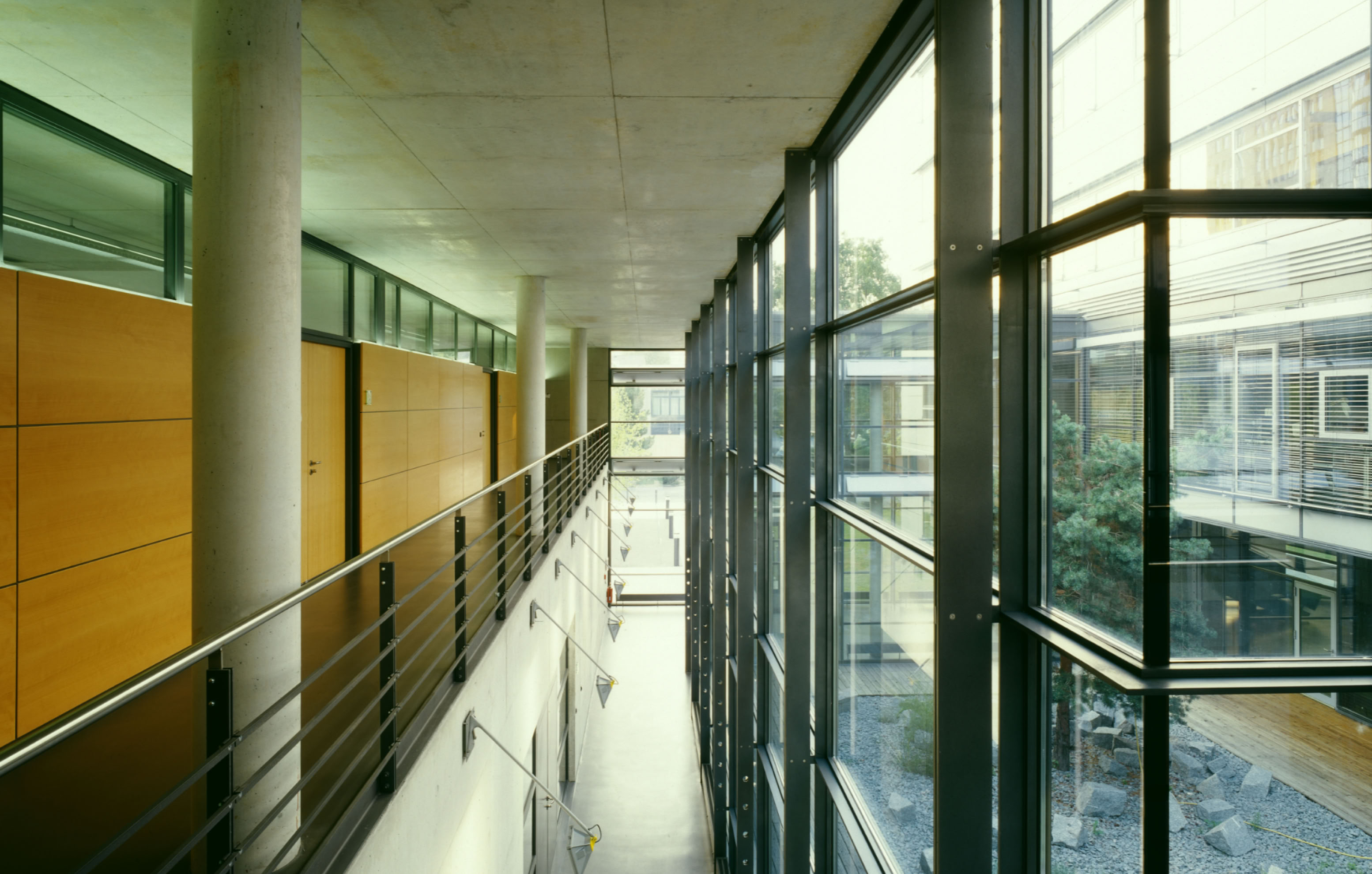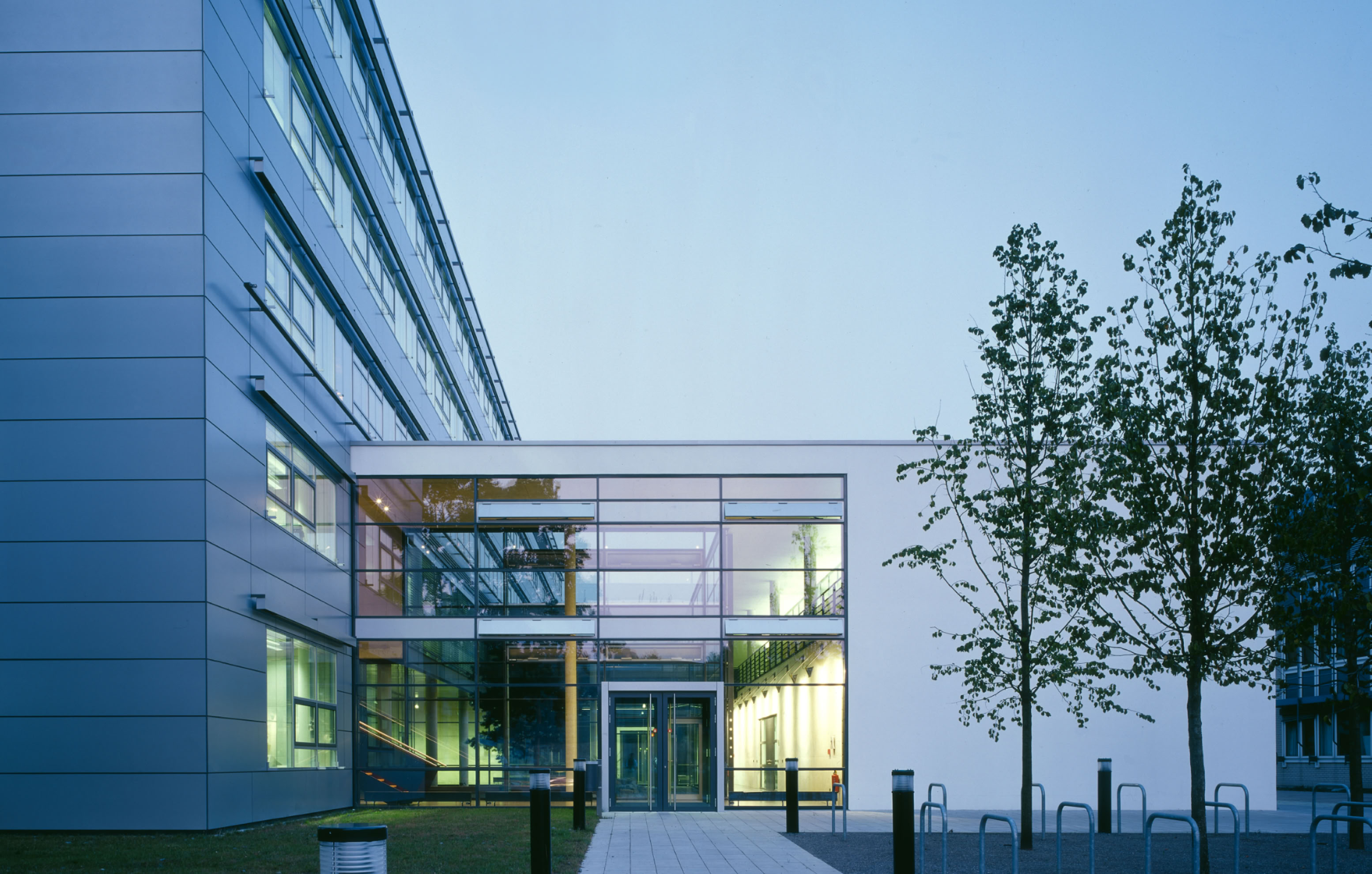 Alle Erschließungsflächen orientieren sich zur Straße, während die Arbeitsräume sich dem ruhigeren Innenbereich des Gebäudeensembles zu wenden. Der Eingangsbereich wurde um ein offenes, kommunikatives Atrium entwickelt. Die Flächen werden für Präsentationen der Fachbereiche genutzt. Die einfache Grundstruktur des Gebäudes gewährt eine leichte Orientierbarkeit. Die Labore, Seminar- und Büroräume werden von einer hellen, in weiten Bereichen raumhoch verglasten Flurzone erschlossen. Die äußere Gestalt interpretiert durch die Verwendung präziser Metallpaneelelemente und minimierte, bündig verarbeitete Stahl-Glasfassaden den technischen Habitus des Gebäudes.
