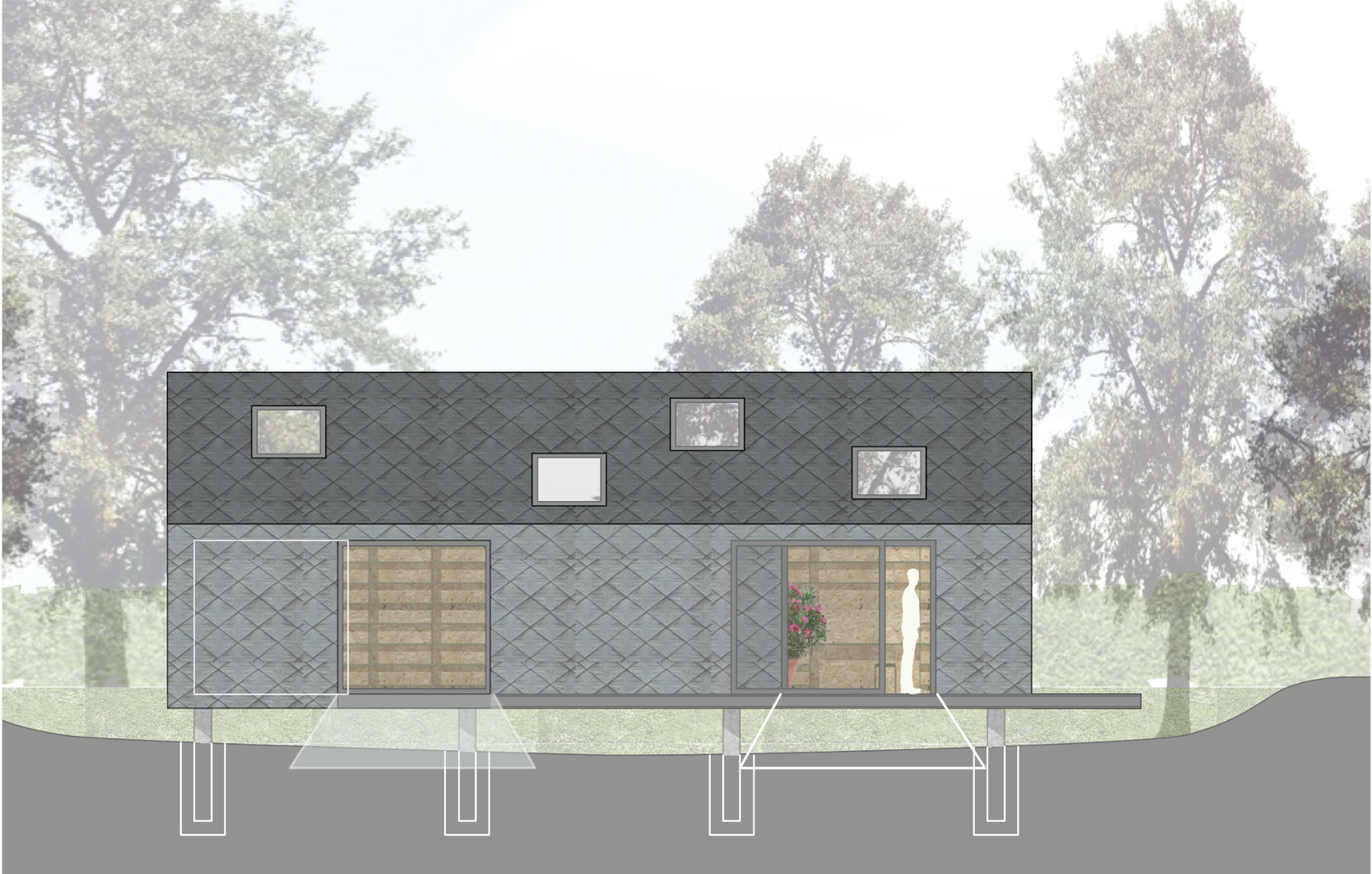 Möglichst sparsame Erdarbeiten, ein "schwebendes" Haus. Die Bodensenke bleibt, der Schuppen wird auf Pfähle gegründet.