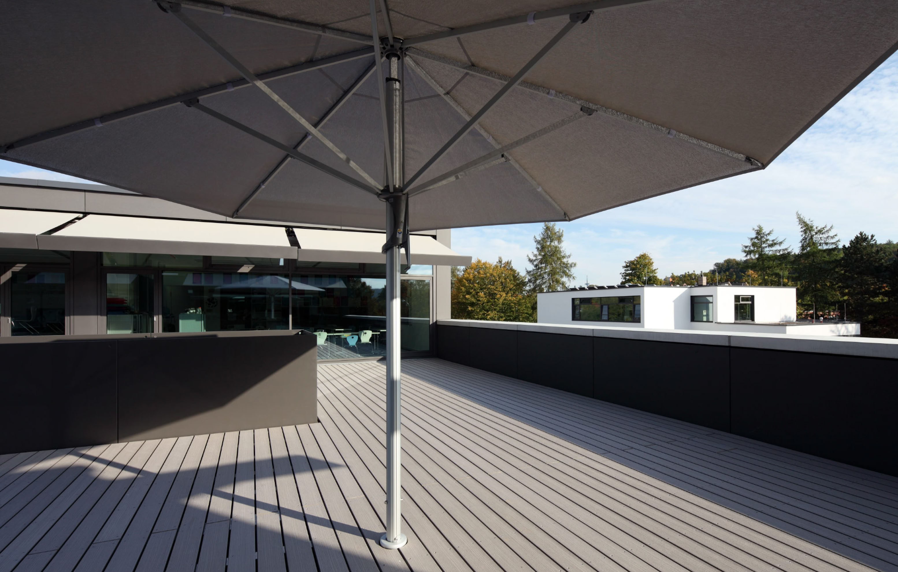 Eine auf Schienen gelagerte Gitterrostebene überbrückt das Gefälle und dient als minimierte Zugangsplattform, darunter bleibt es grün.