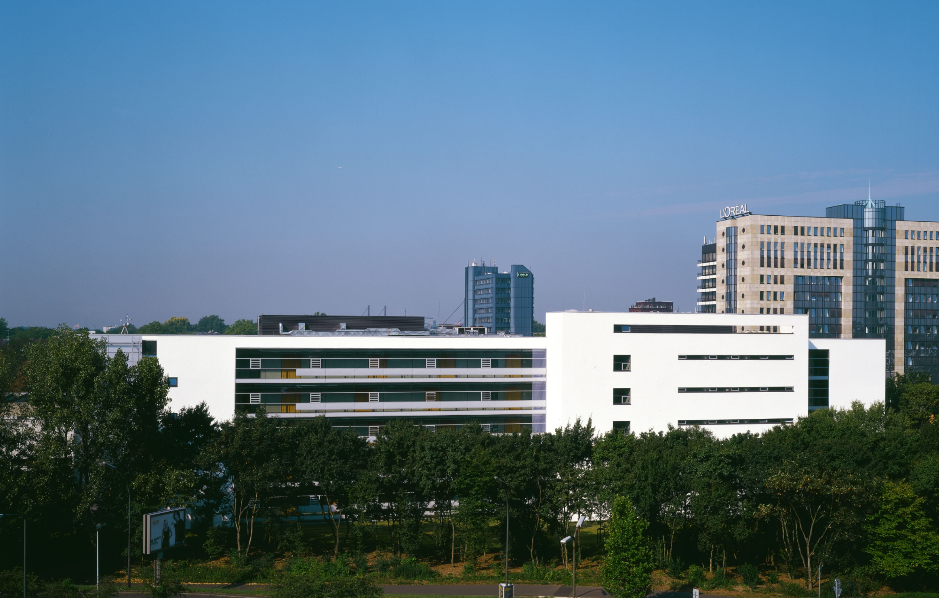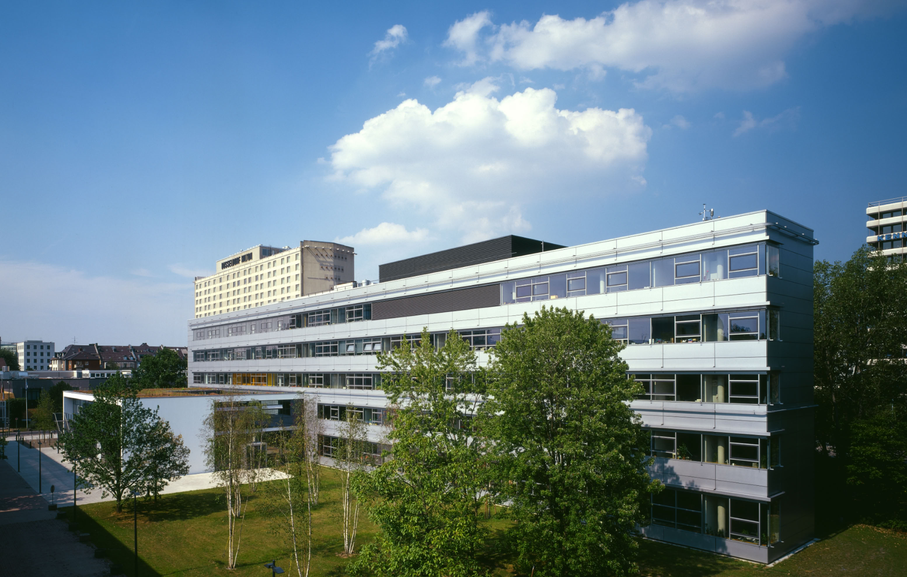 Der fünfgeschossige Gebäuderiegel bildet einen markanten Abschluß der Fachhochschule zum stark befahrenen Flughafenzubringer "Kennedydamm".