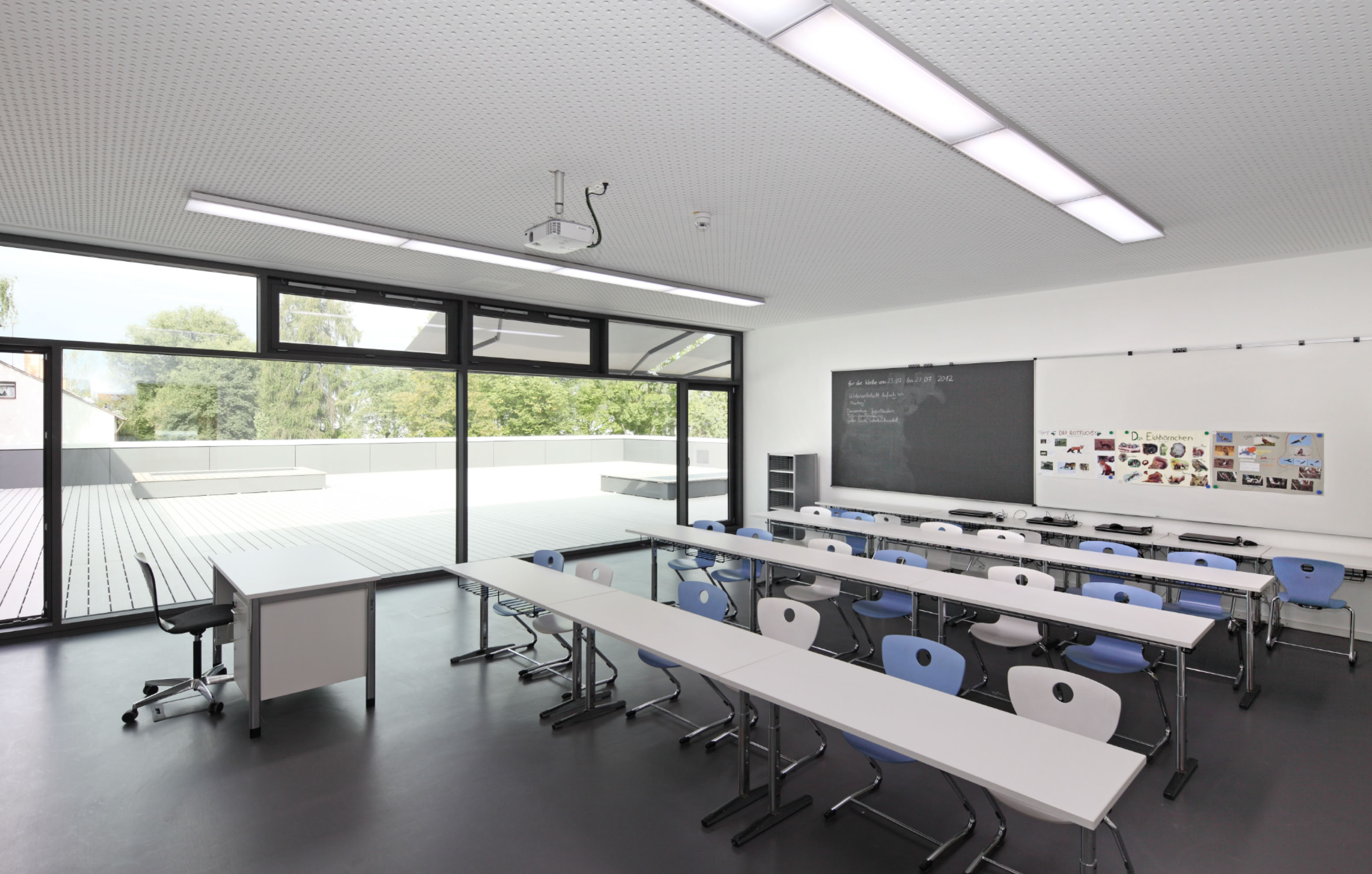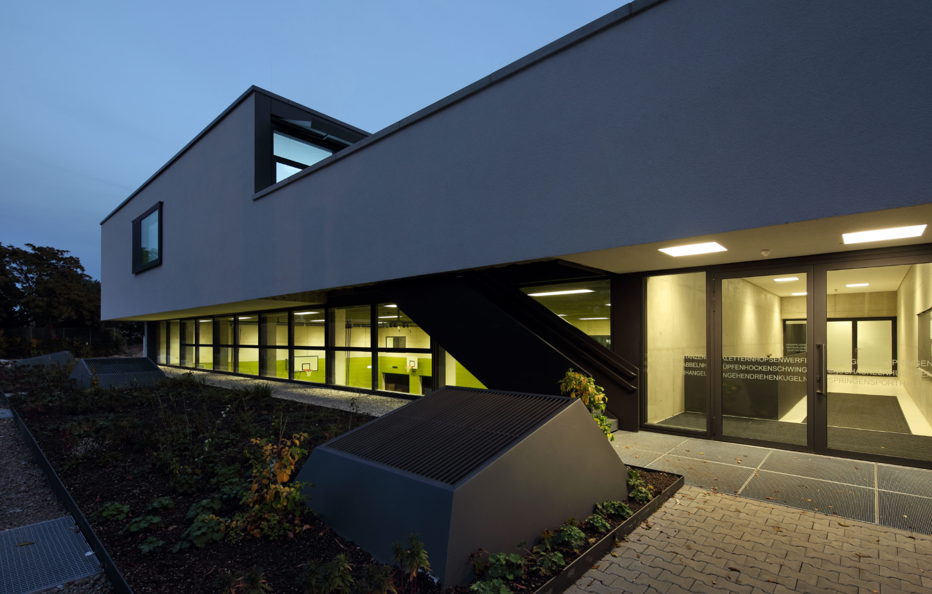 Der Lehrerparkplatz, der Zugang zum Verwaltungsbereich und ein Eingang zu den Sporthallen für externe Nutzer befinden sich an der nördlichen Gebäudeseite.